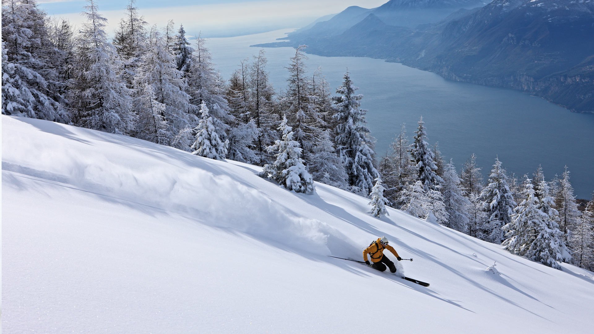 Лыжник экстремально спускается с горы, снег блестит на солнце
