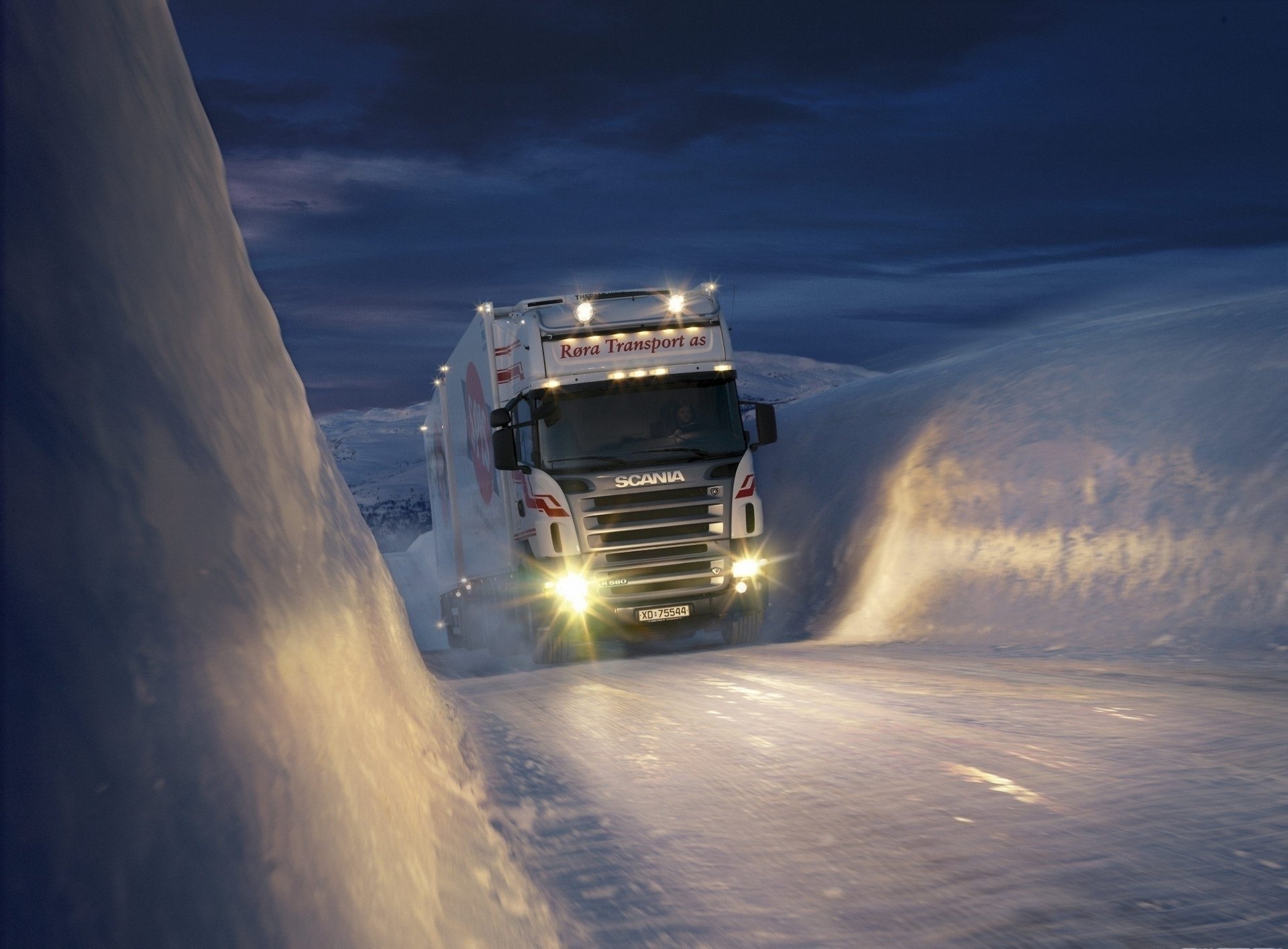 Белый грузовик пробирающийся сквозь льды на фоне ночного неба