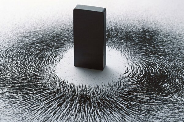 Чёрный магнит на белом фоне с металлическими опилками вокруг