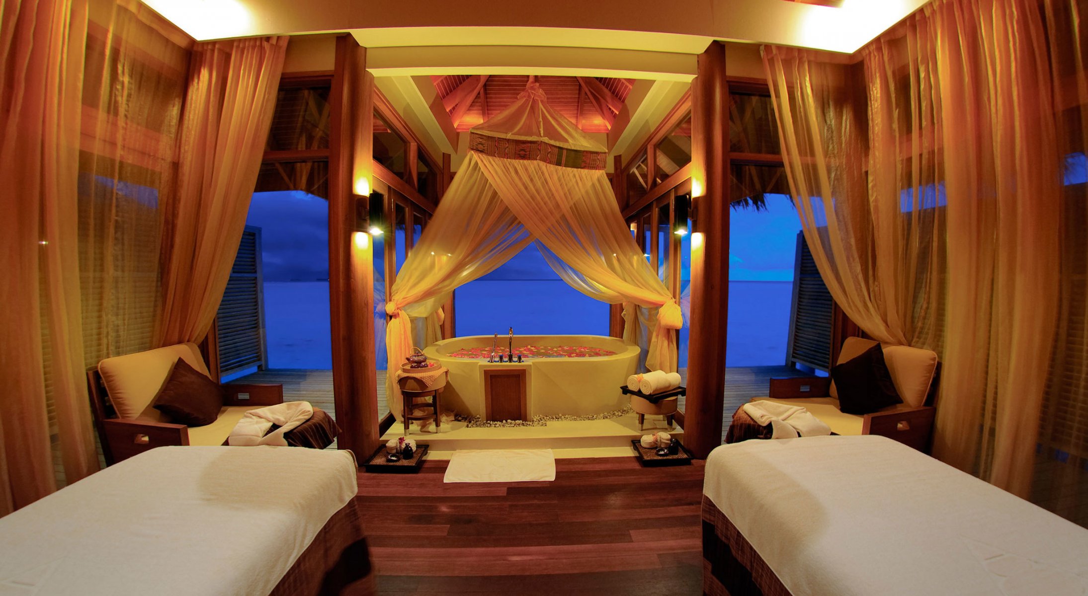 Уютная комната для массажа с расслабляющей ванной с лепестками роз
