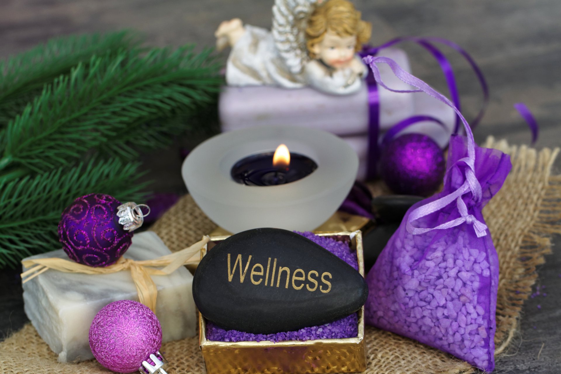 Камень для массажа на фоне еловой ветви, ангела и новогодних шаров