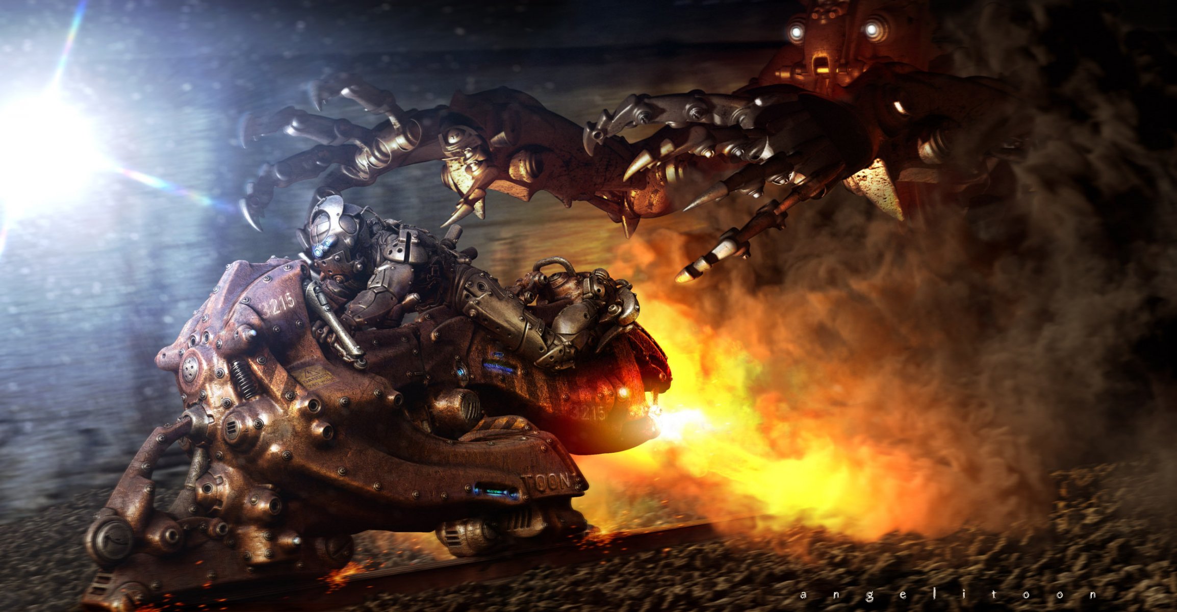 Мотоцикл с гонщиком уезжает от надвигающихся на него механических рук