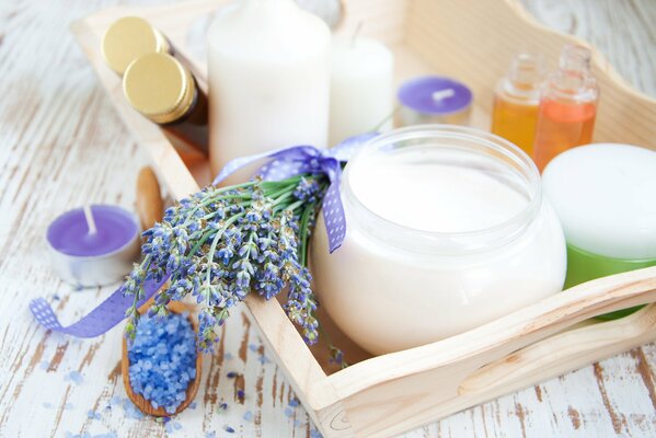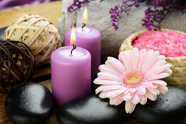 Ветка лаванды перевязанная ленточкой лежащая между свечей рядом с ложкой морской соли для ванны