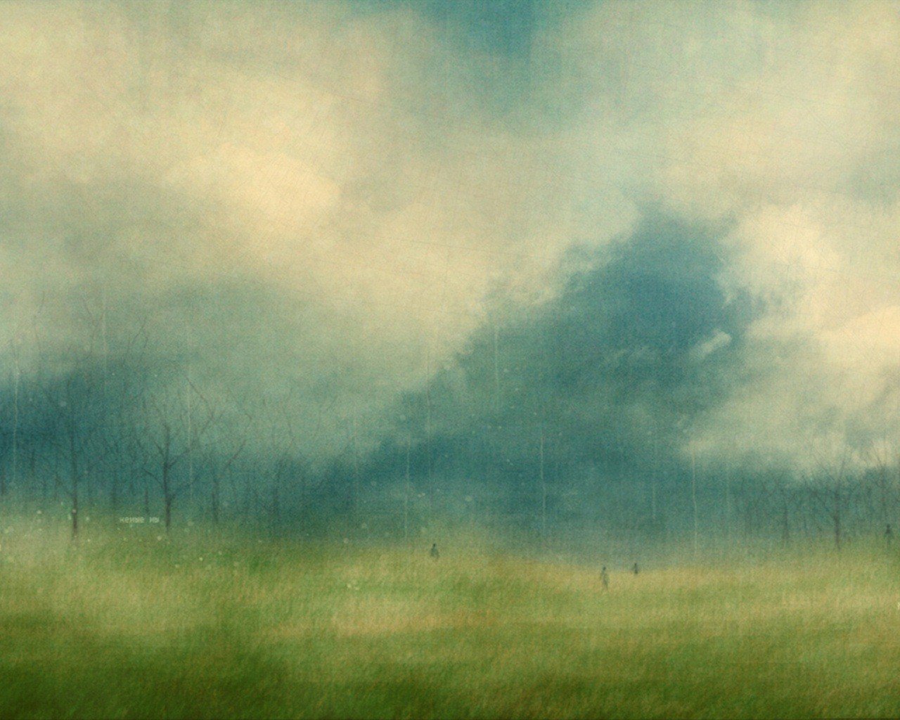 Девушка в фиолетовом с повязкой на лице гладит единорога на мутном бело-сером фоне