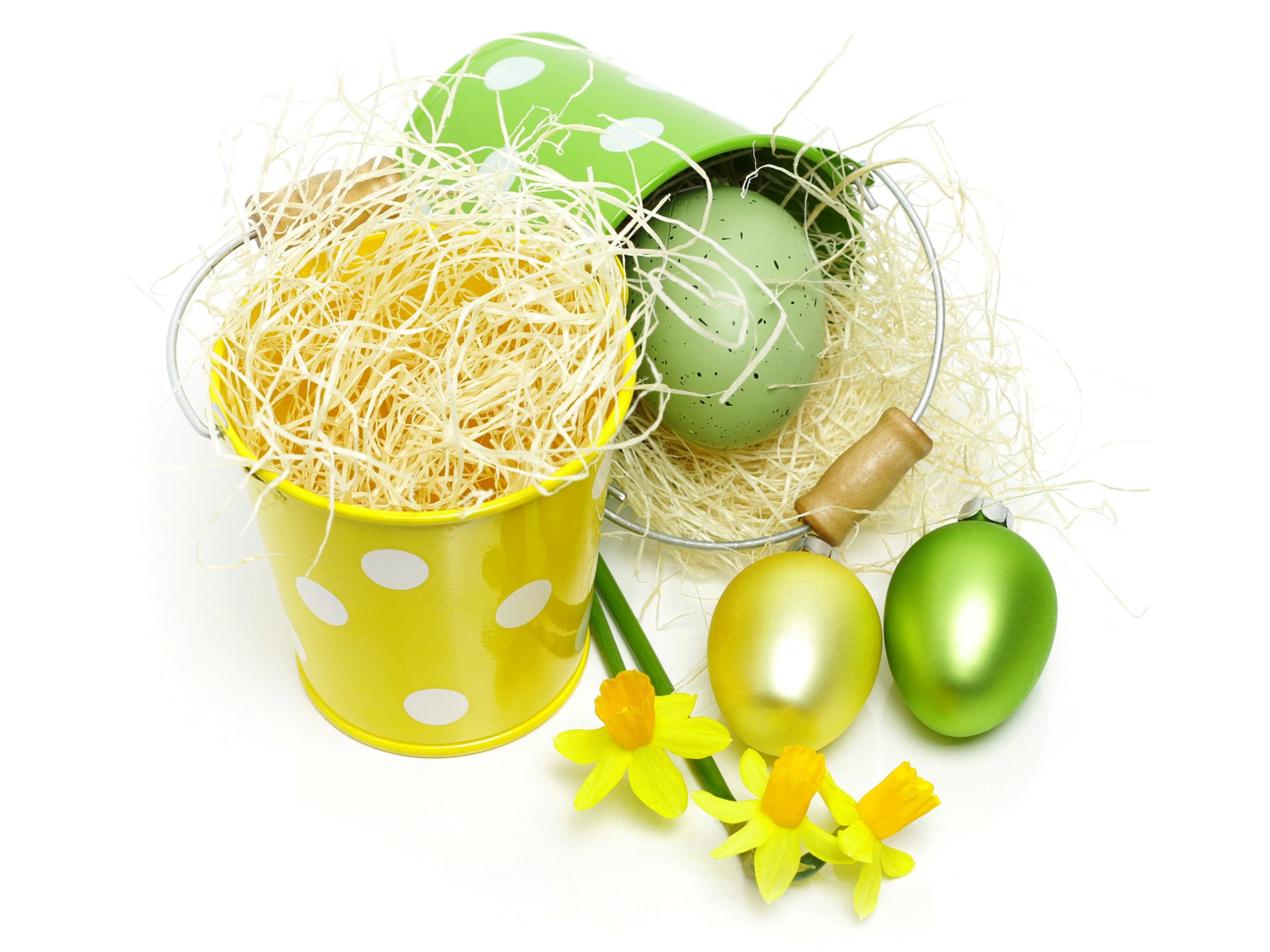 Два ярких ведёрка, крашеные пасхальные яйца и нарциссы