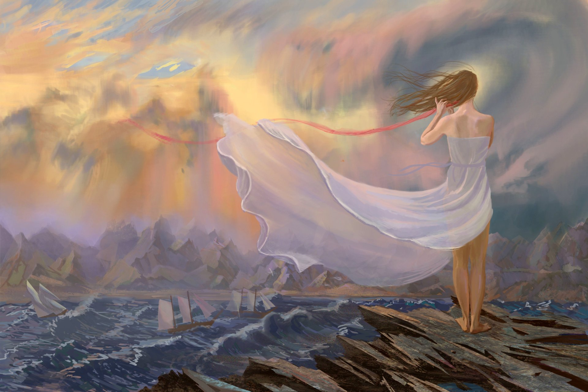 Ожидание своего любимого суженого, Ожидание суженого на краю берега, вдали белеет парус одинокий в тумане море голубом, прекрасная девушке на берегу речки