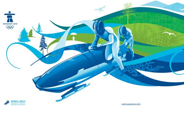 Сноубордист в полете на фоне сине зелёной эмблемы олимпиады 2010