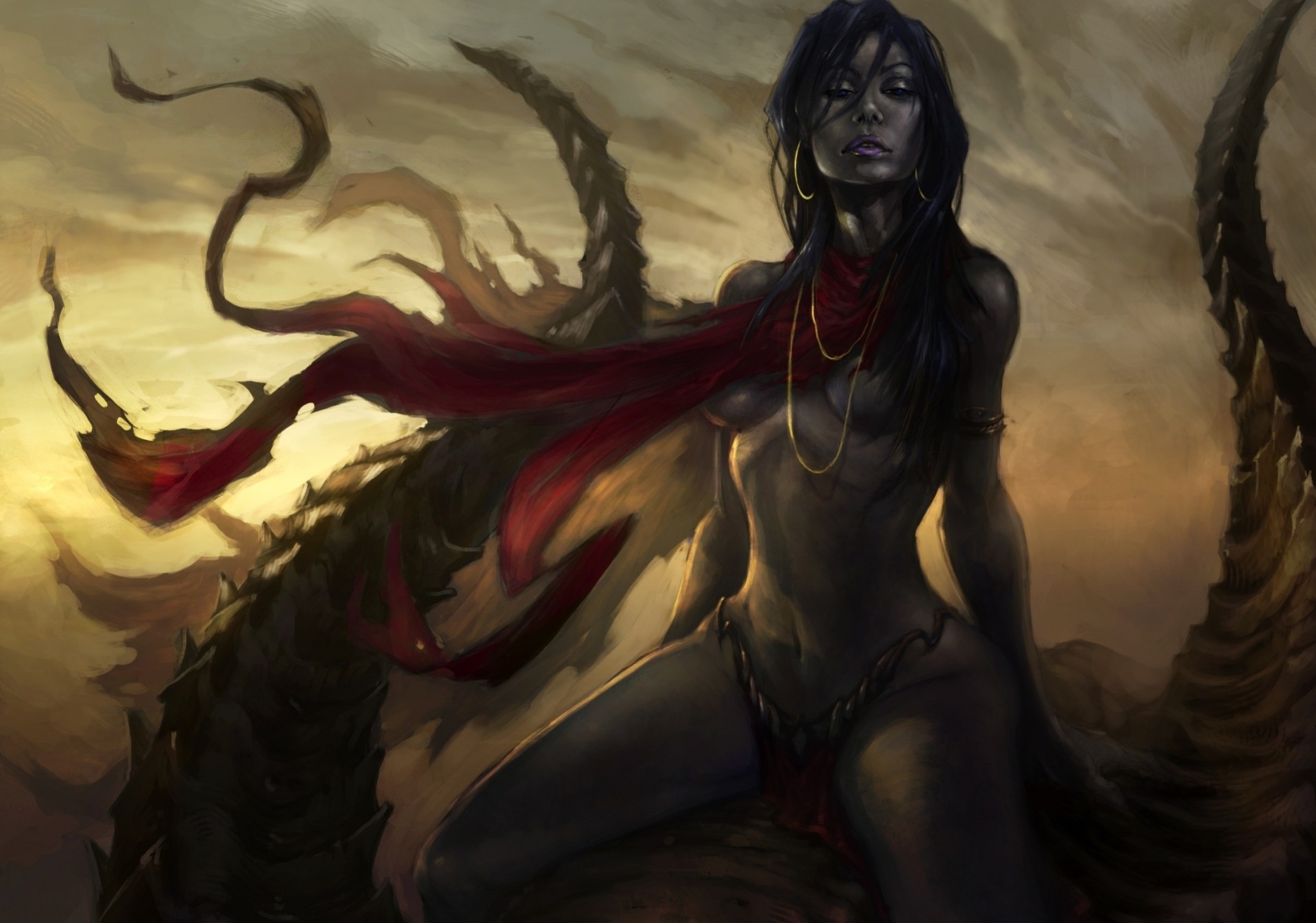 Арт искусство, девушка в позе сидя, на шее украшения иветер развивает кровавый шарф, пробуждает фантазии