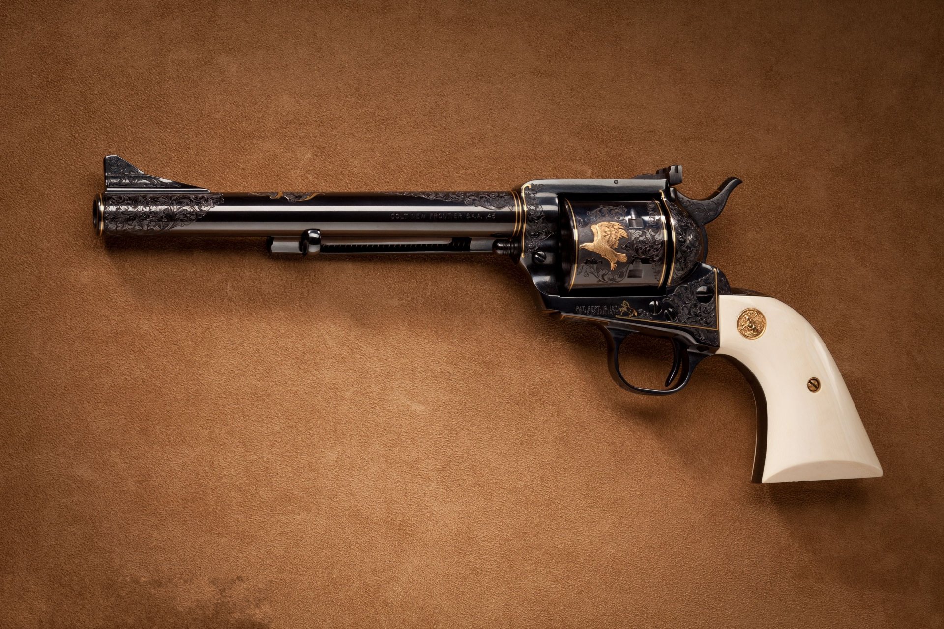 Пистолет с белой рукоятью на коричневом фоне