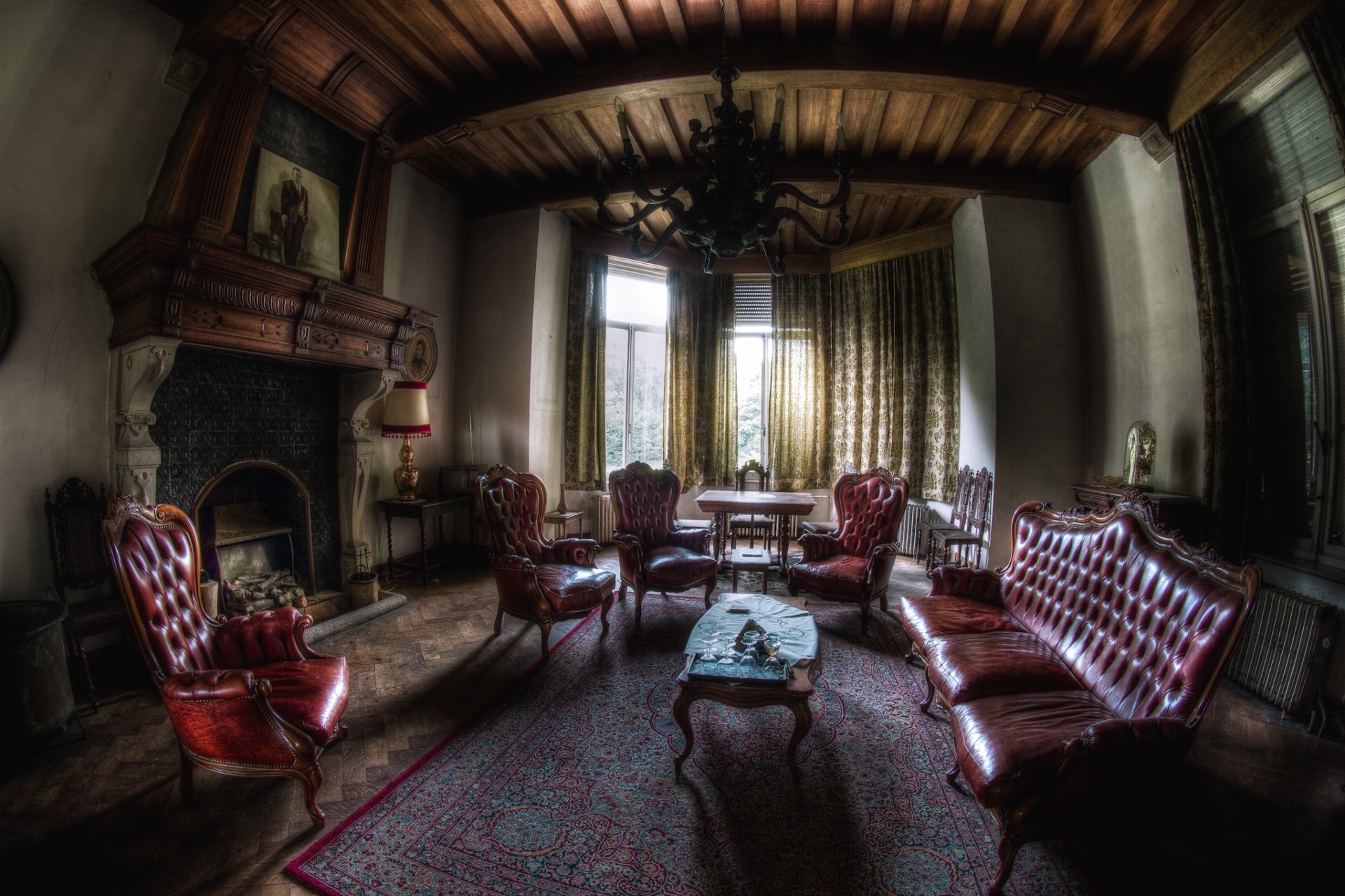 Интерьер особняка в большой комнате расположен камин а во круг диван и стулья