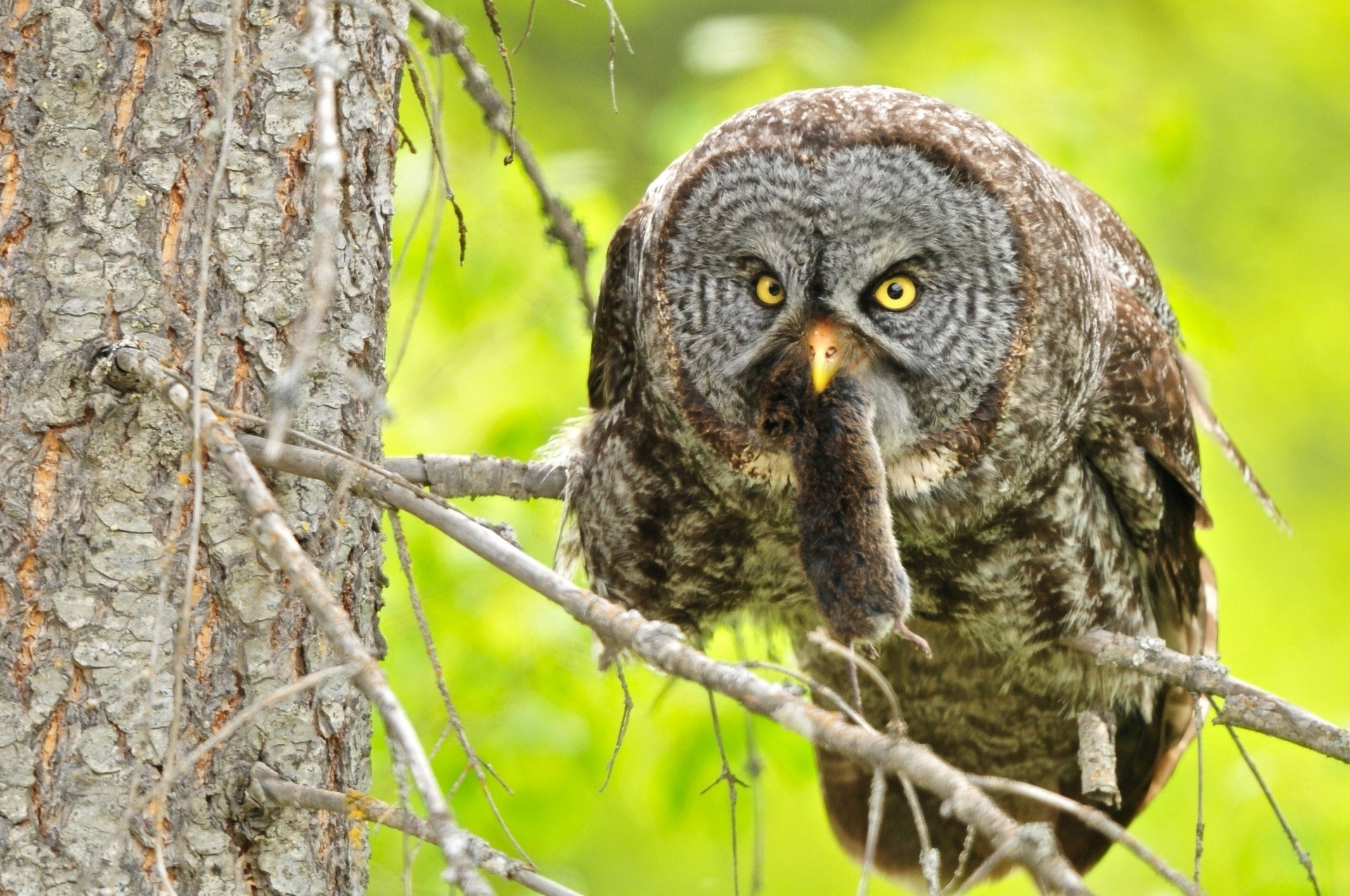 Бородатая неясыть охотиться на дереве