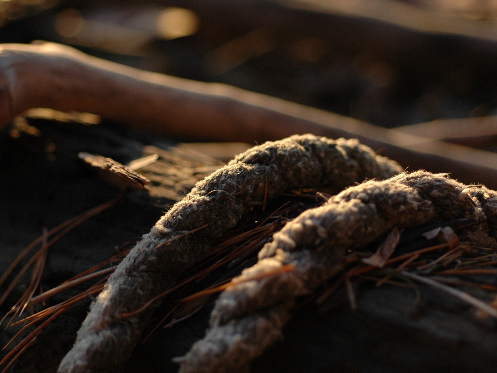 Канат лежащий в траве, окружённый палками