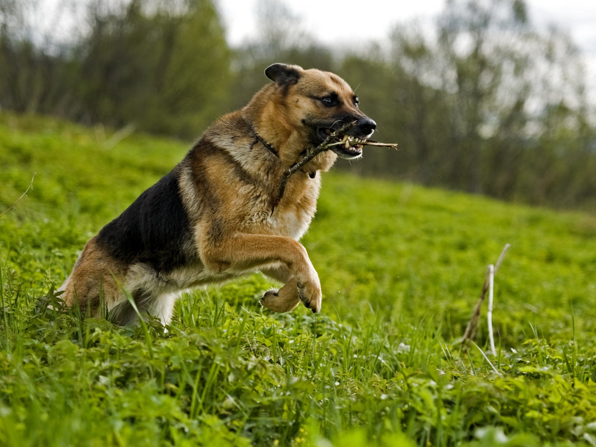 Бегущая по траве собака с палкой в зубах