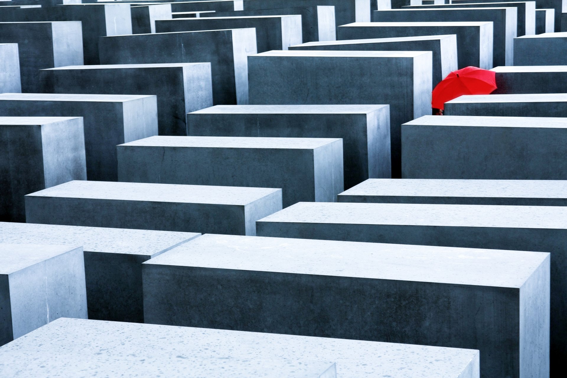 Множество серых плит и стен разного размера, и красный зонт рядом с одной из них