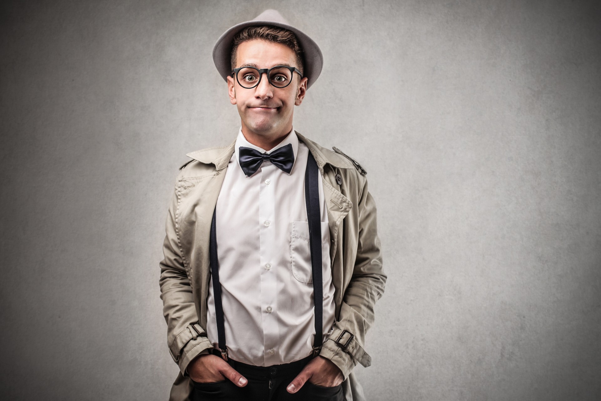 Человек в подтяжках, шляпе, очках и пальто стоит возле серой стены