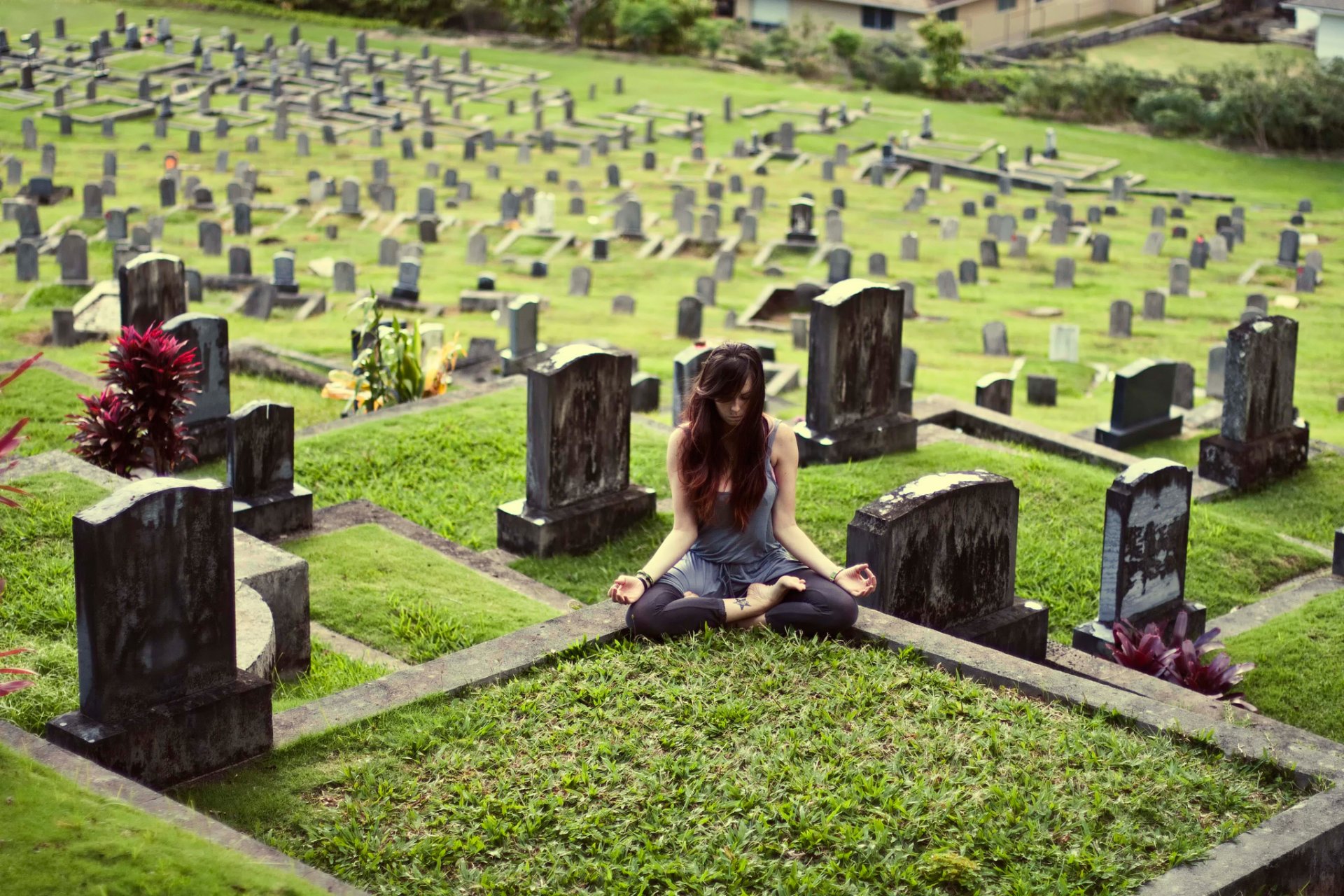 Девушка сидит в позе лотоса и пускает мыльные пузыри