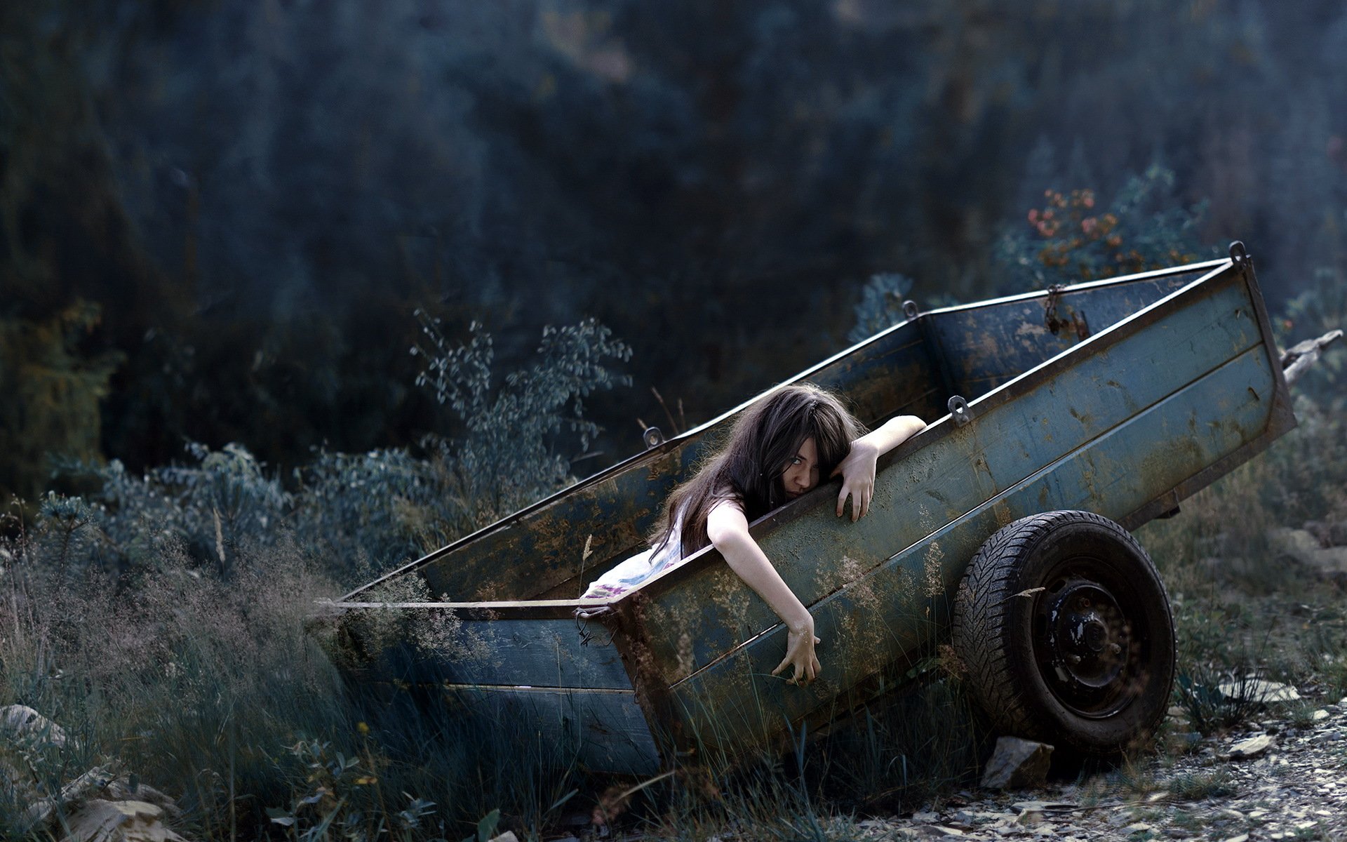 Девушка лежит в прицепе