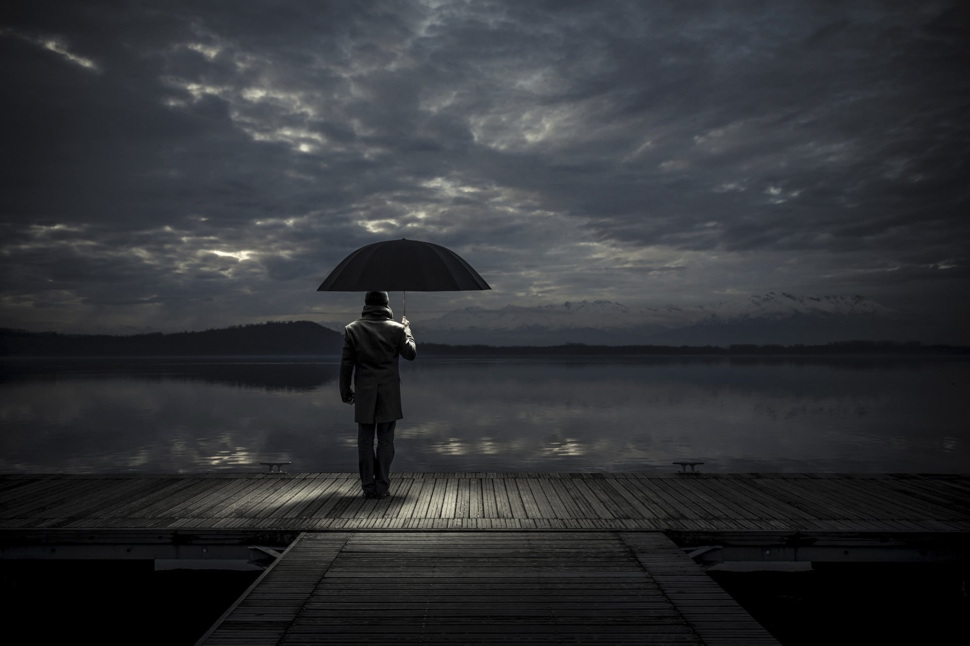 Девушка ночью стоит на причале с лампой и выглядывает лодку