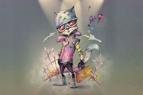 Кот путишествующий по свету , рядом воздушные шары и ветряки