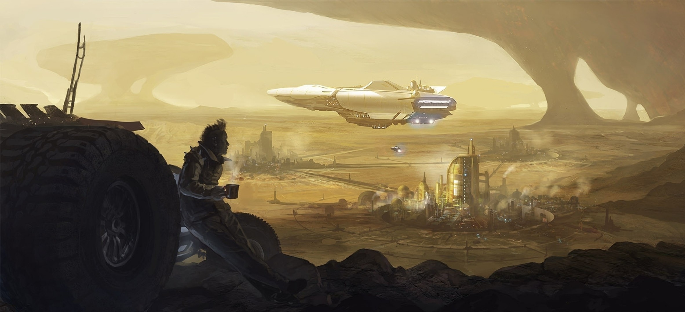 Пустыня. Путник пьет кофе в неизвестной вселенной