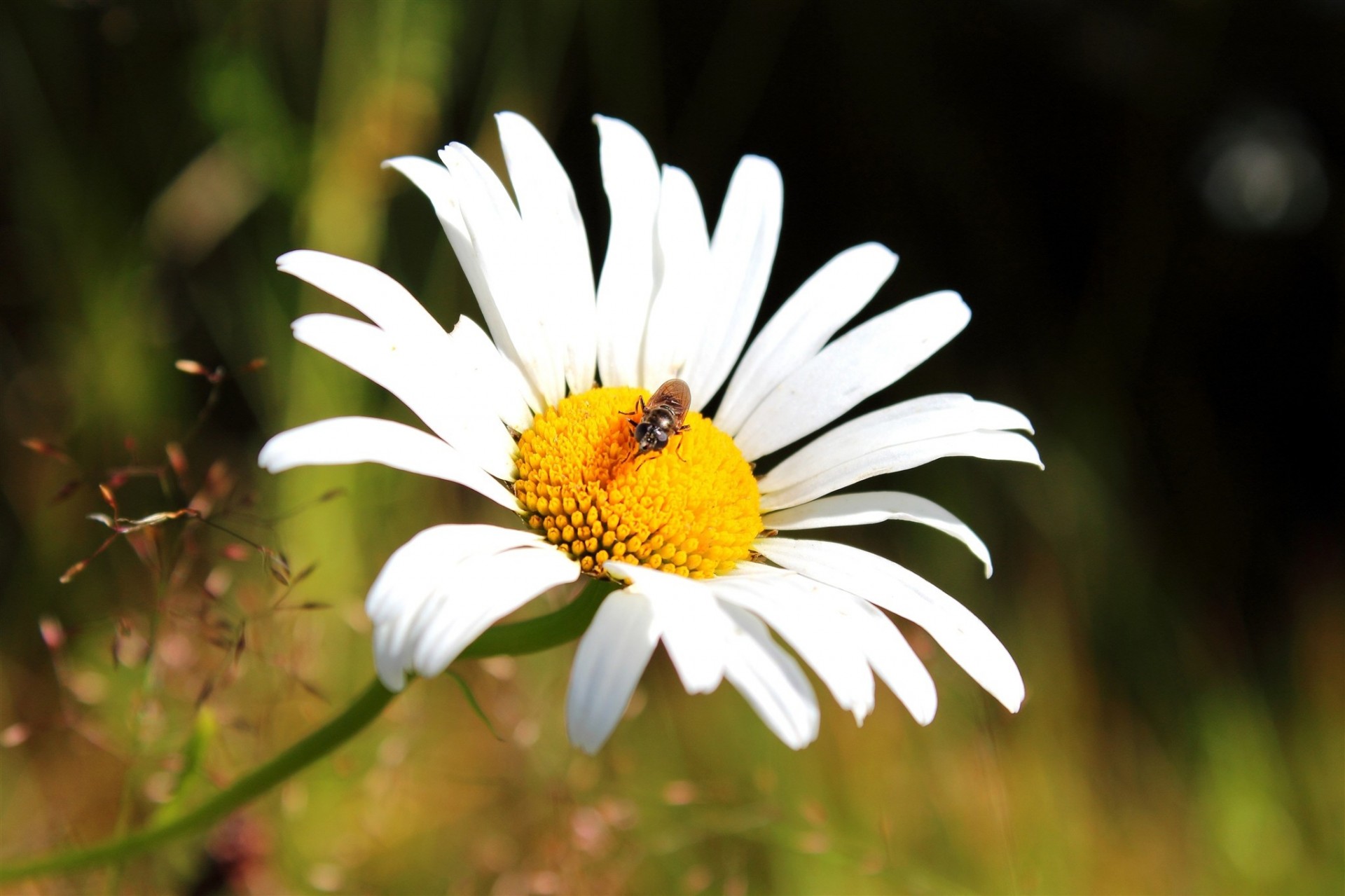 Макросъёмка цветка ромашки с пчелой