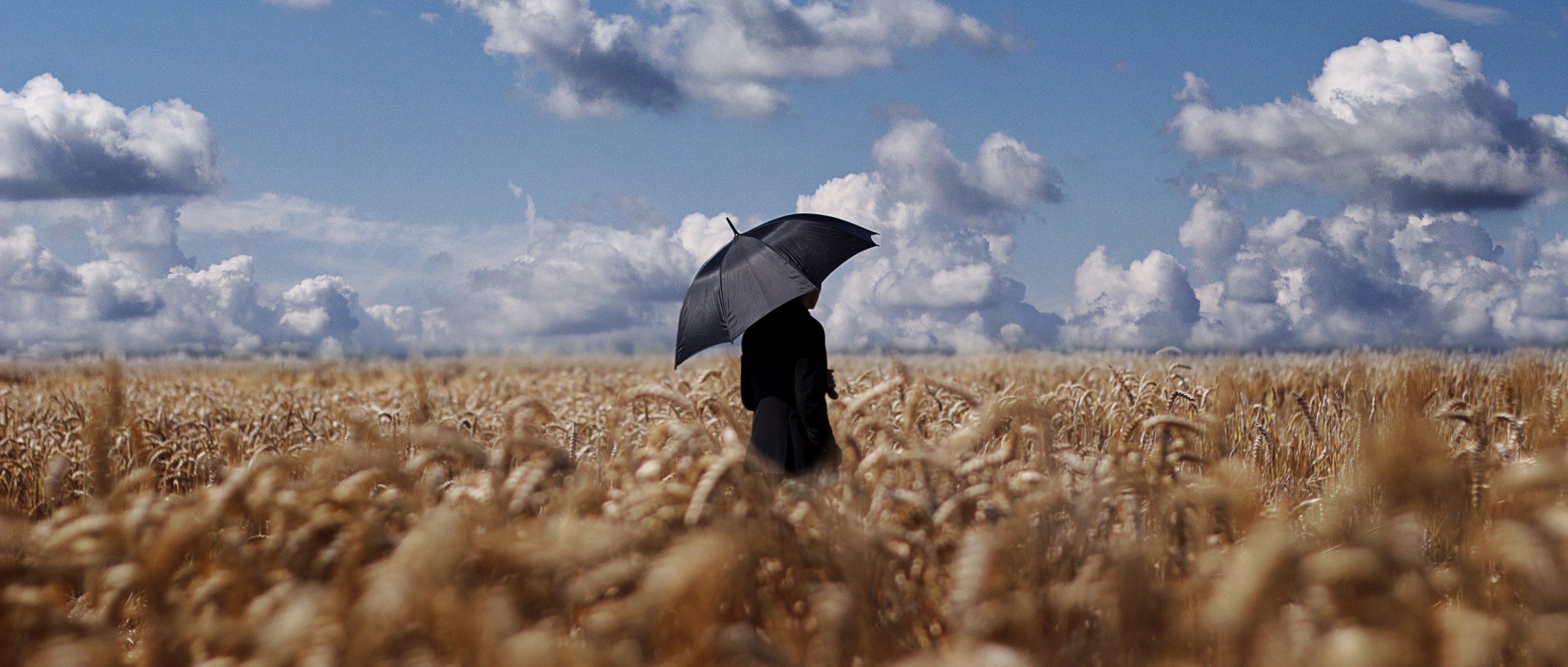 На пшеничном поле мужчина с чёрным зонтиком