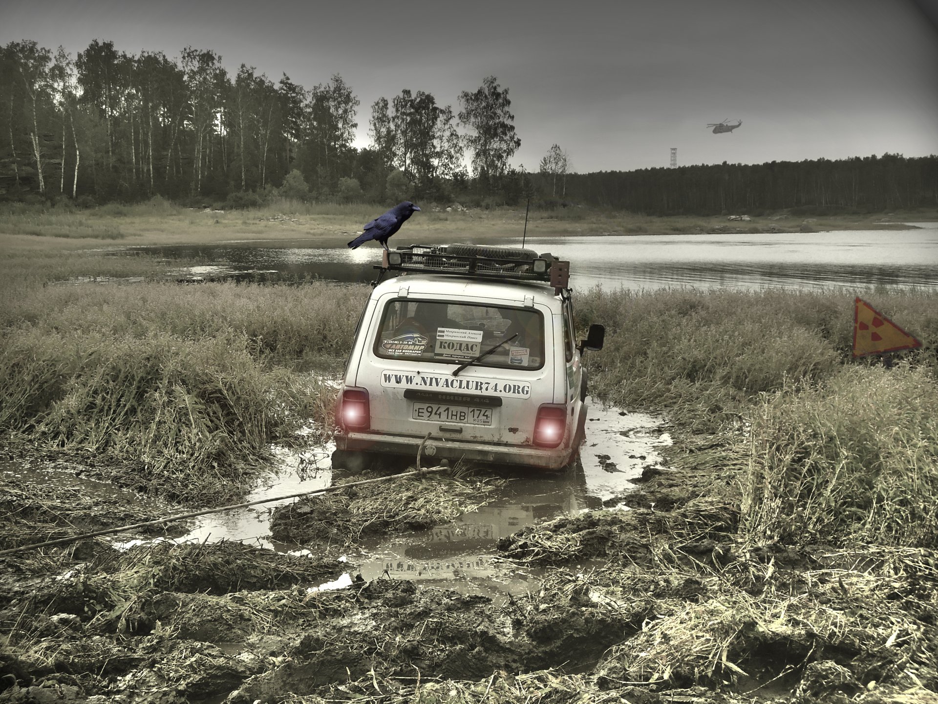 Чернобыльский сталкер , нива застрявшая в грязи с вороном на крыше. Вокруг лес и радиация