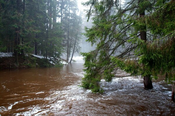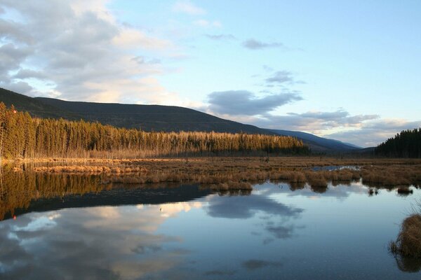 Могучие скалы стоят позади леса. Внизу разлилась река