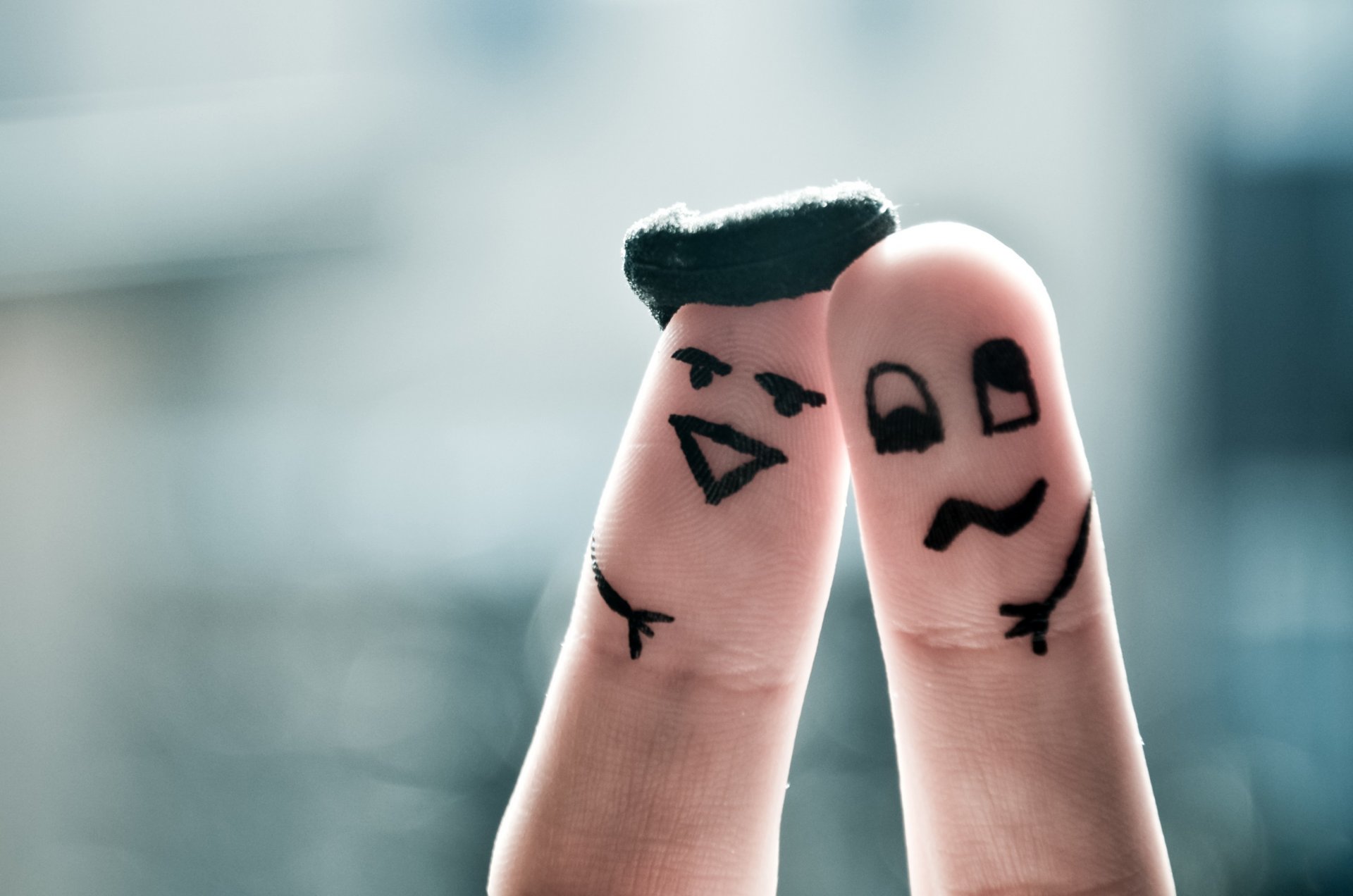 Жених и невеста нарисовали рожицы на пальцах и держатся за руки