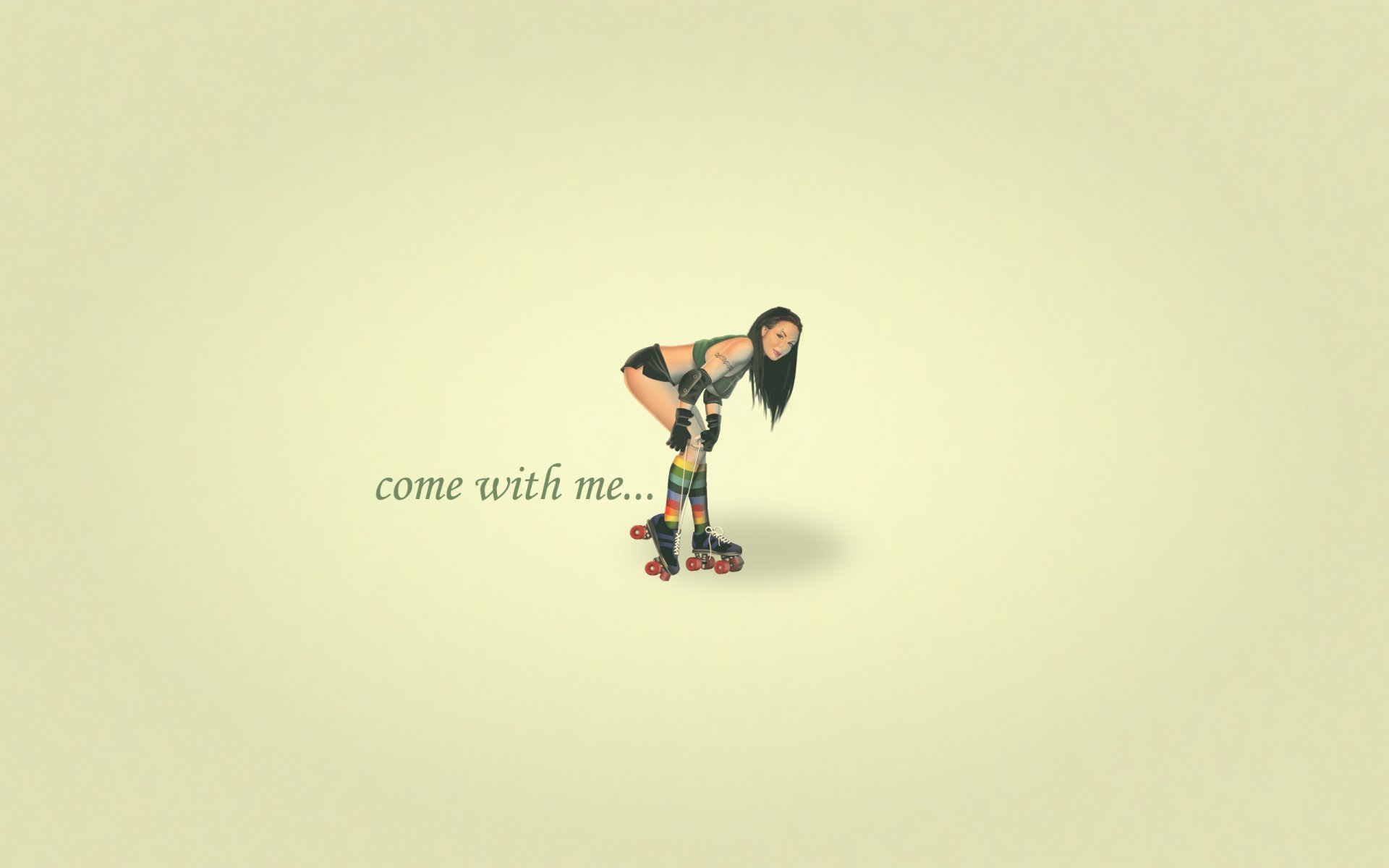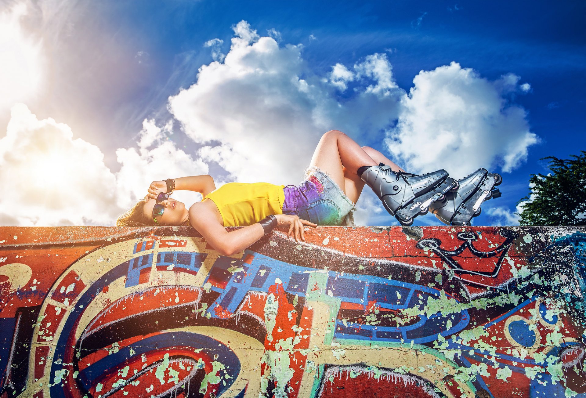 Девушка на роликах лежит на стене с граффити вместе с парнем