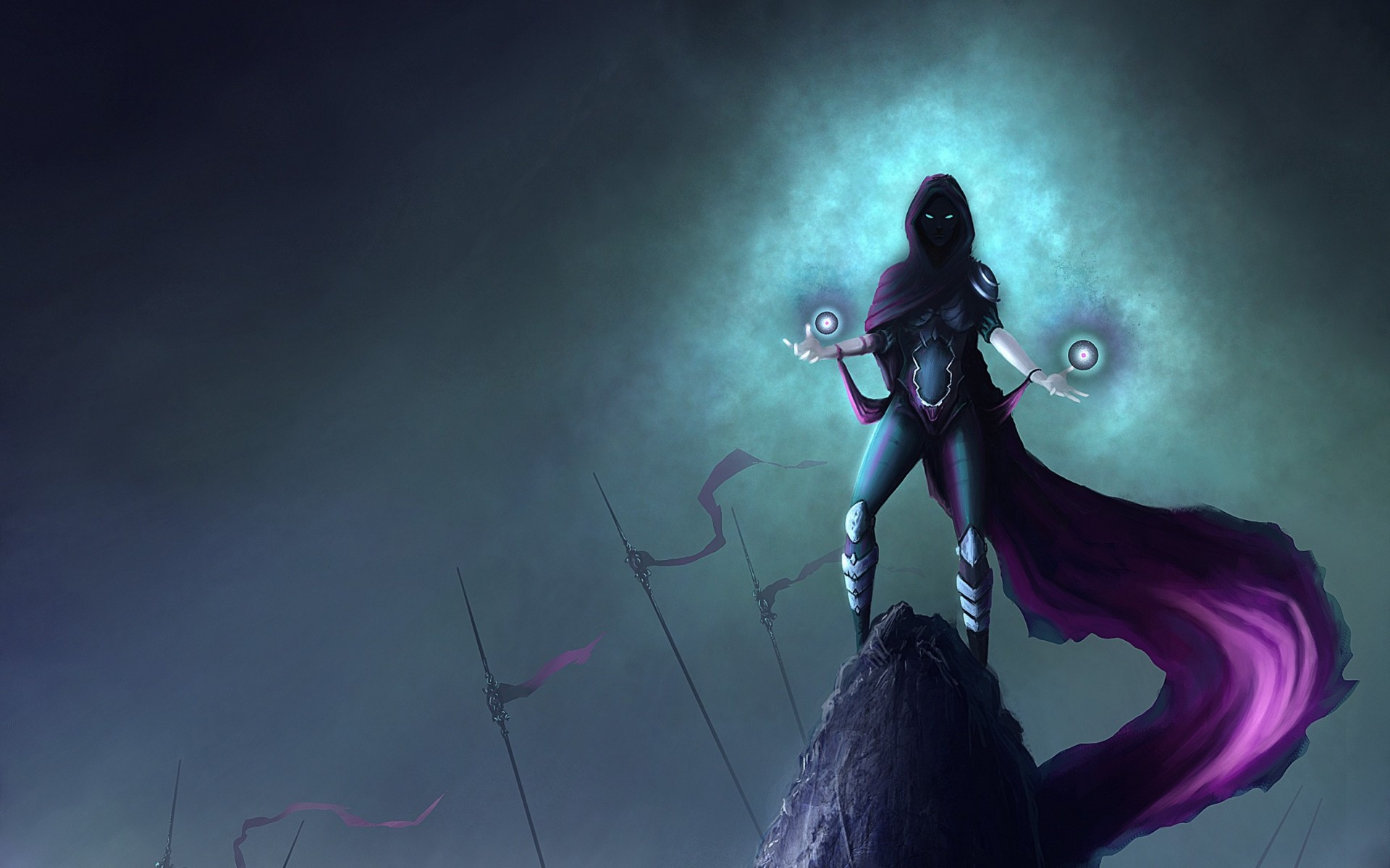 Таинственная девушка с горящими глазами и сгустками энергии в ладонях, стоит на холме в длинном фиолетовом плаще