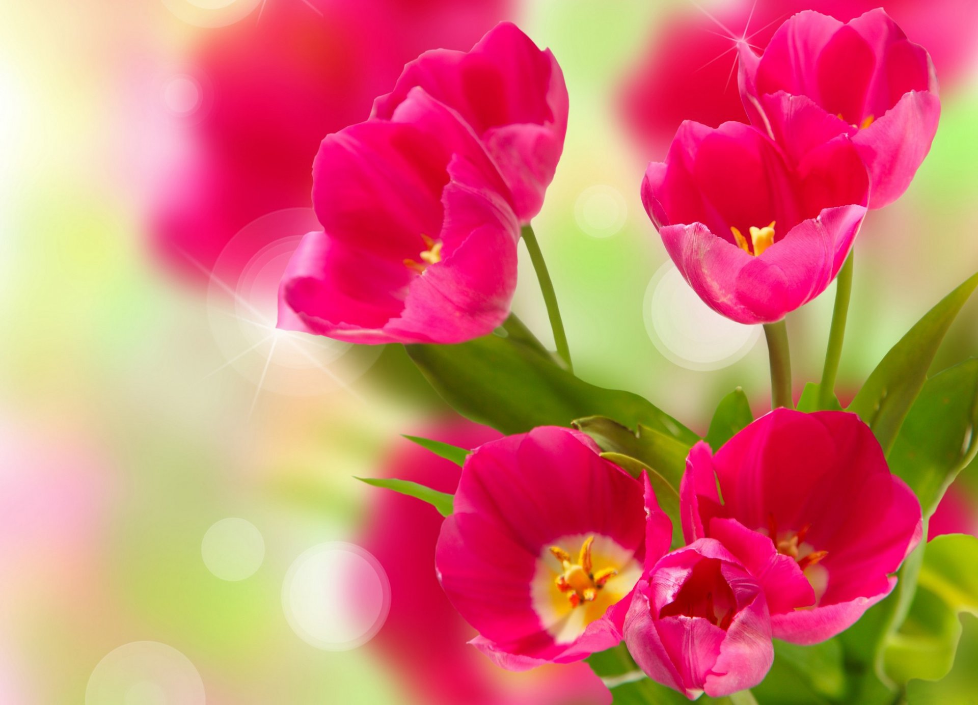 Тюльпаны с белой серединкой на размытом зелёно-розовом фоне