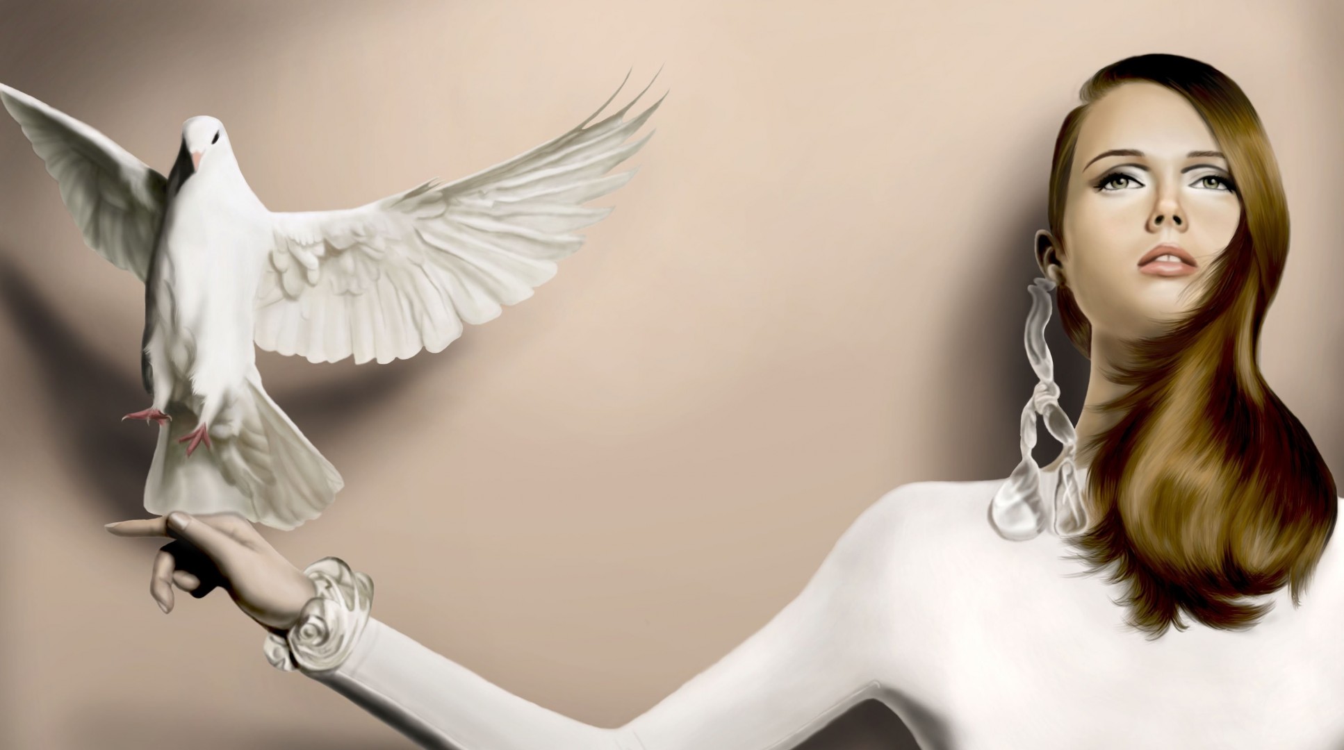 Портрет девушки с большим кольцом на руке и сережками с перьями павлина