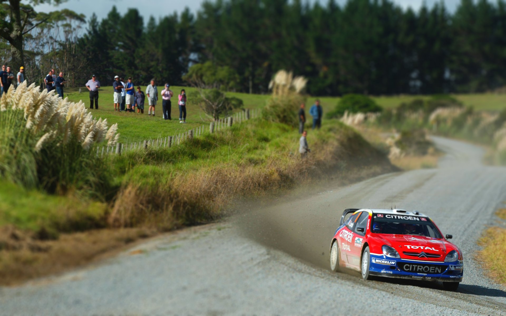 Гоночный Ситроен на повороте с пыльным шлейфом