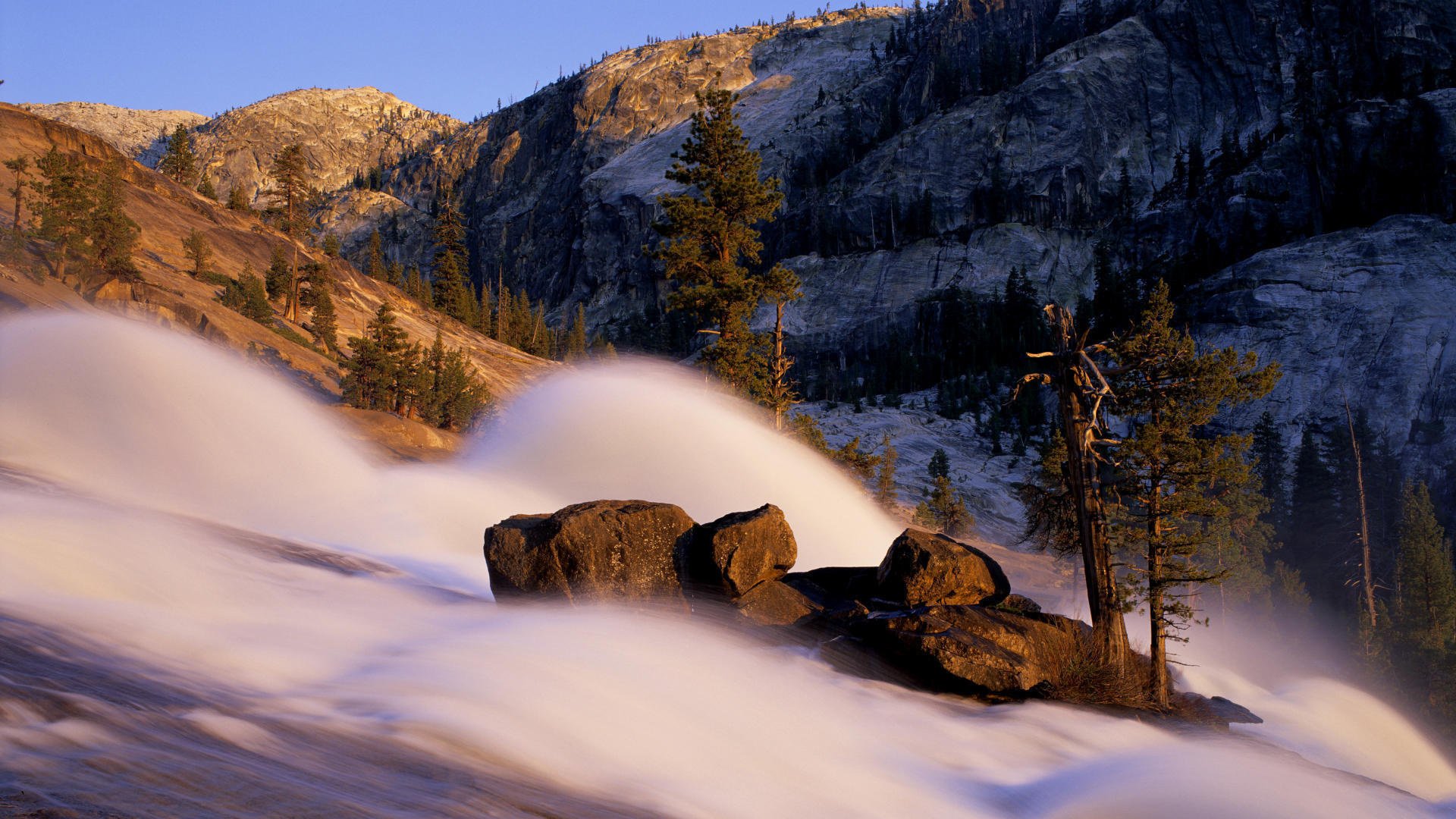 Невероятный контраст пейзажа: солнце с туманом слева, снег у подножия гор справа