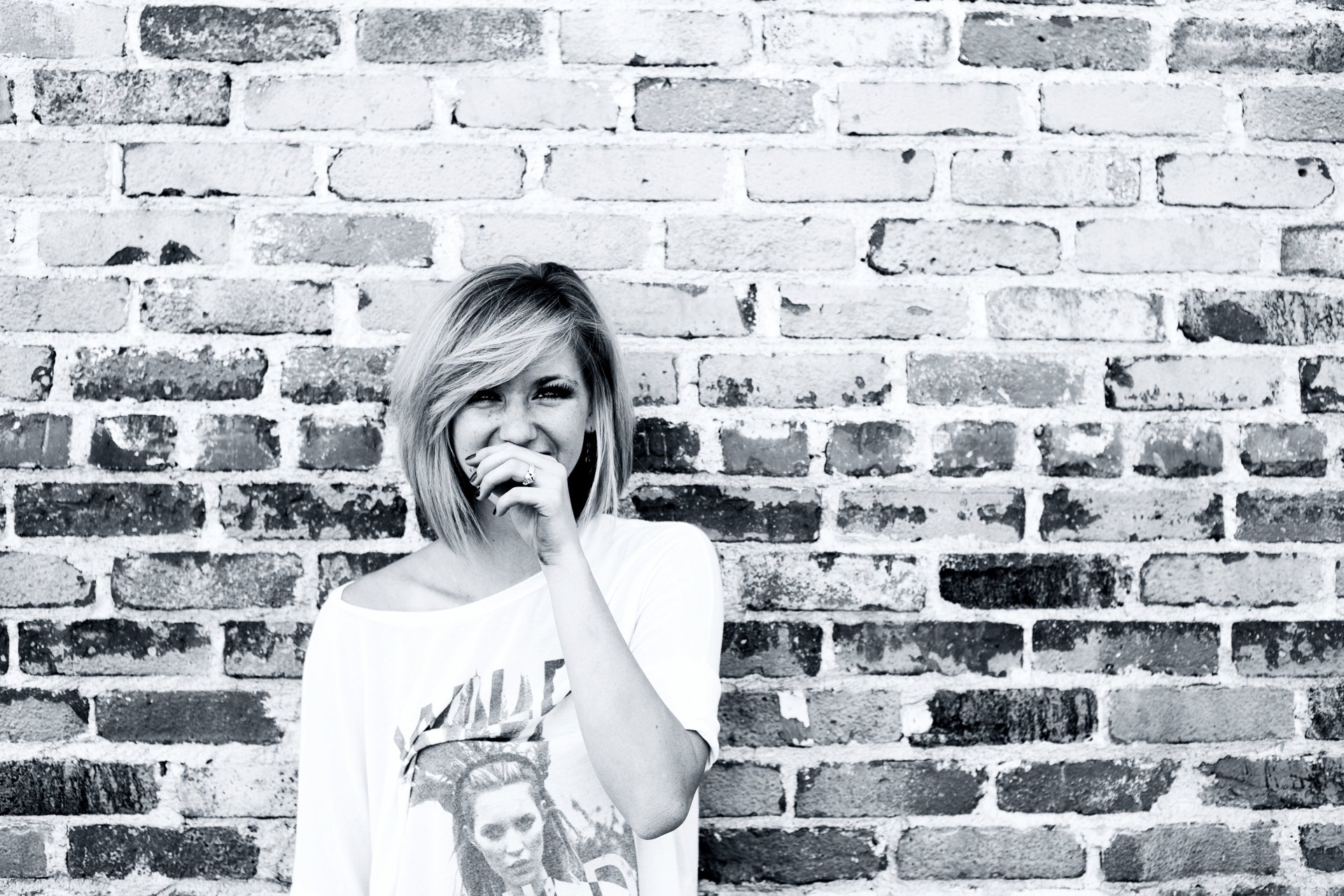 Девушка смеется на фоне кирпичной стены