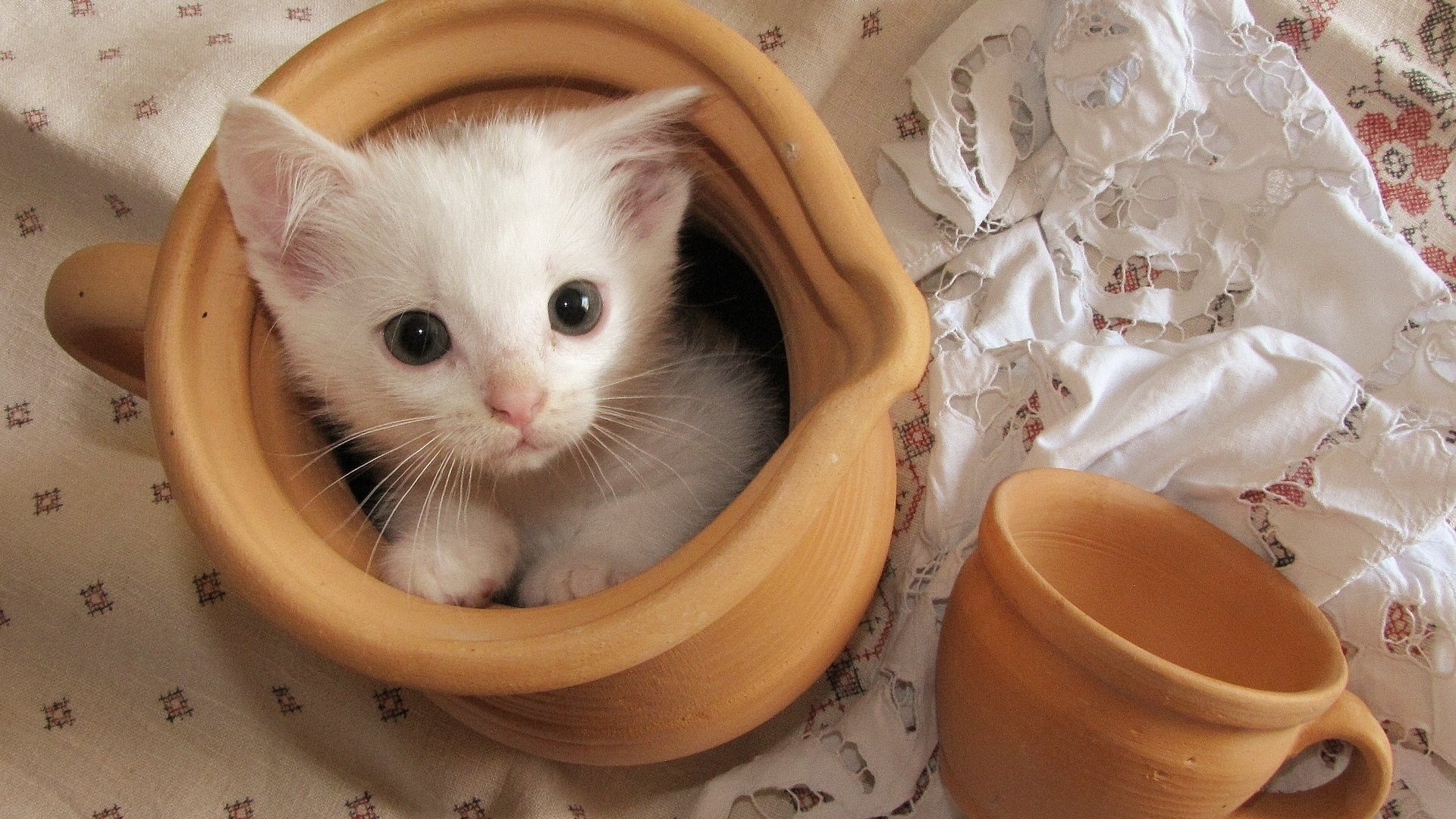 Белый котенок забрался в кувшин