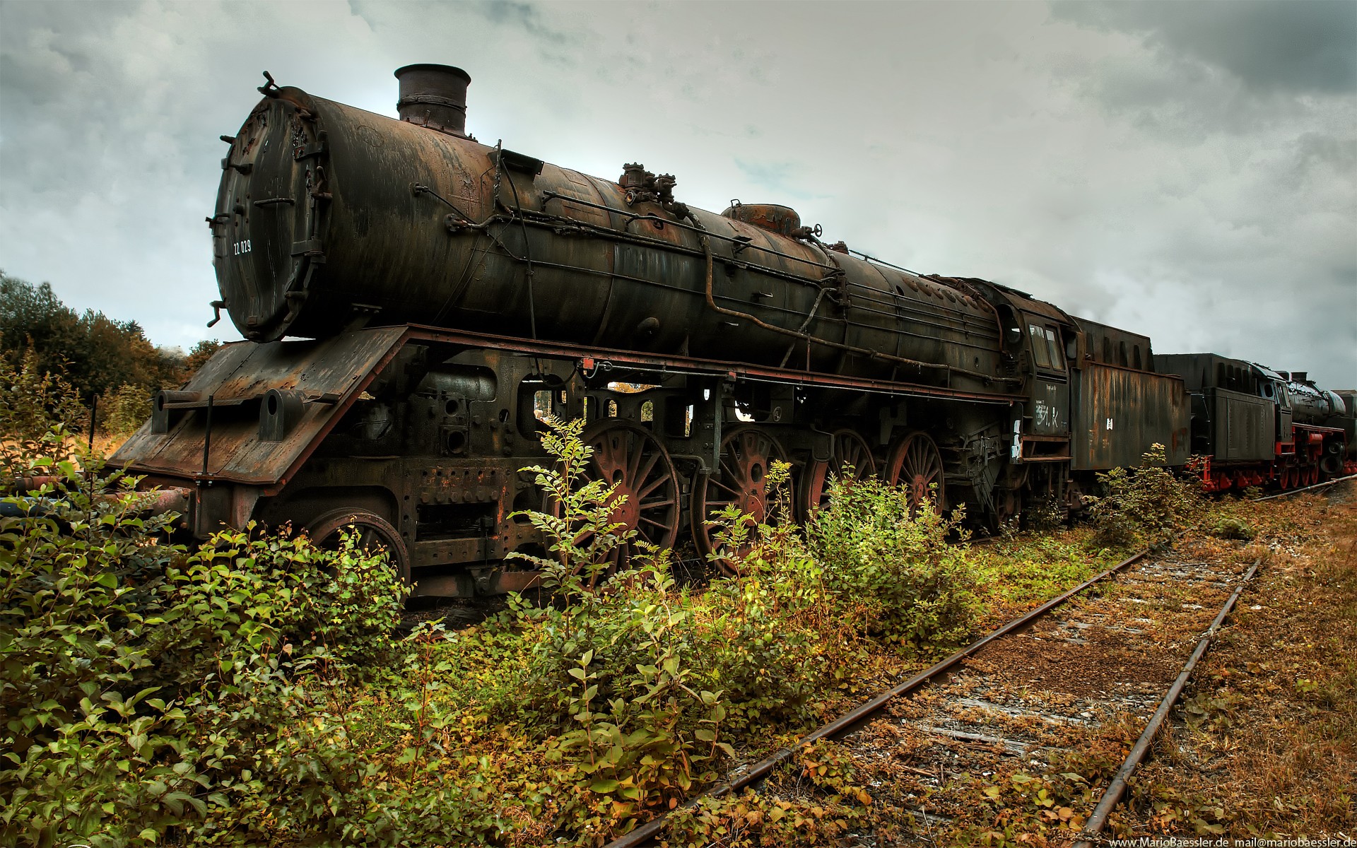 Старый, ржавый состав на фоне рельс и кустов
