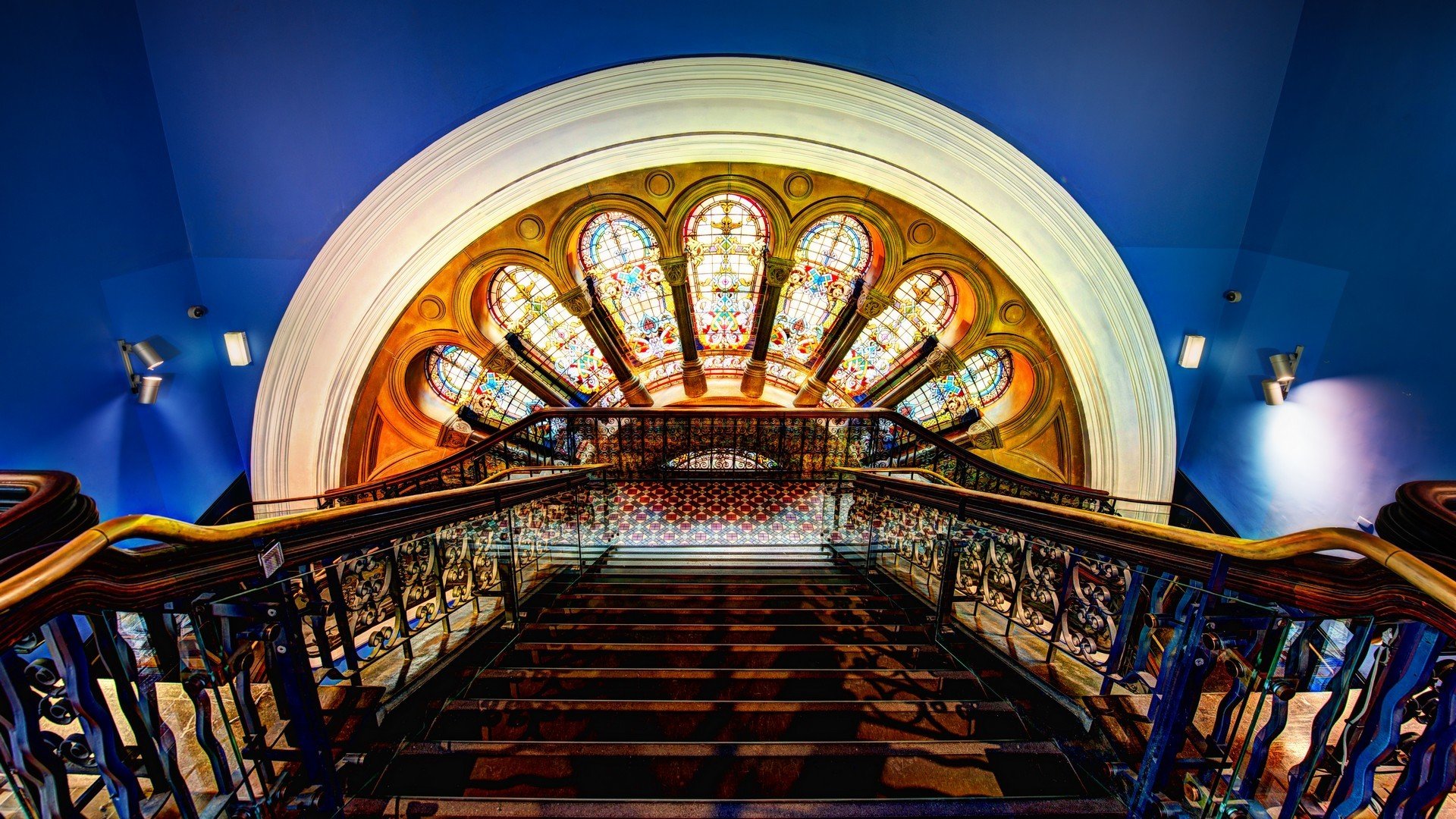 Шикарная лестница на фоне витража