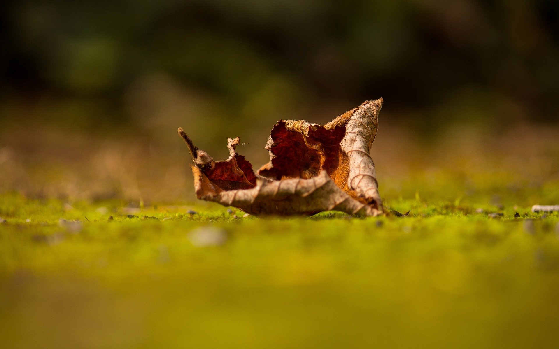 Белый гриб стоит в зелёном мхе, на грибе нём лежит сухой лист, на размытом зелёном фоне