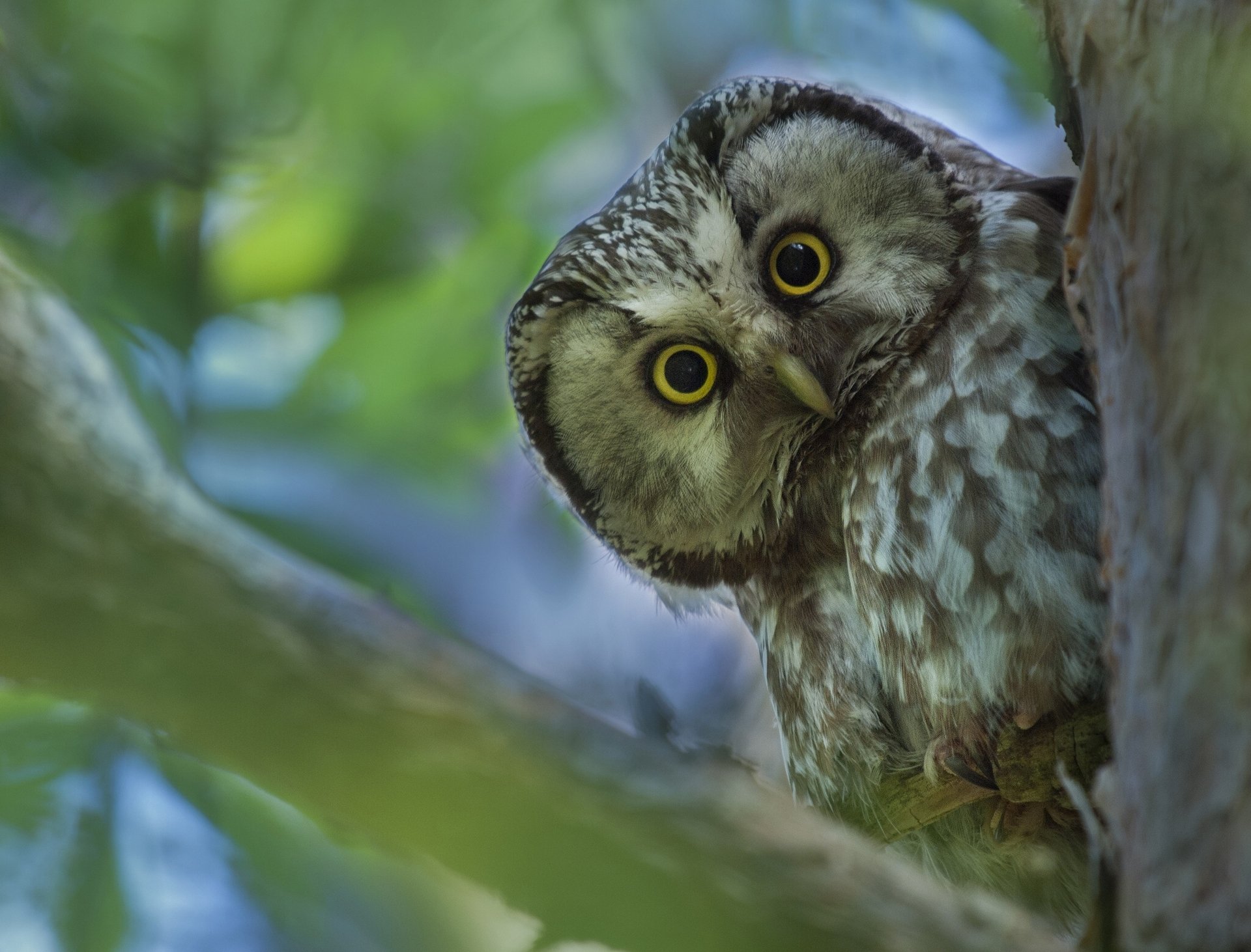 Сливаясь с деревьями вокруг сыч высматривает добычу