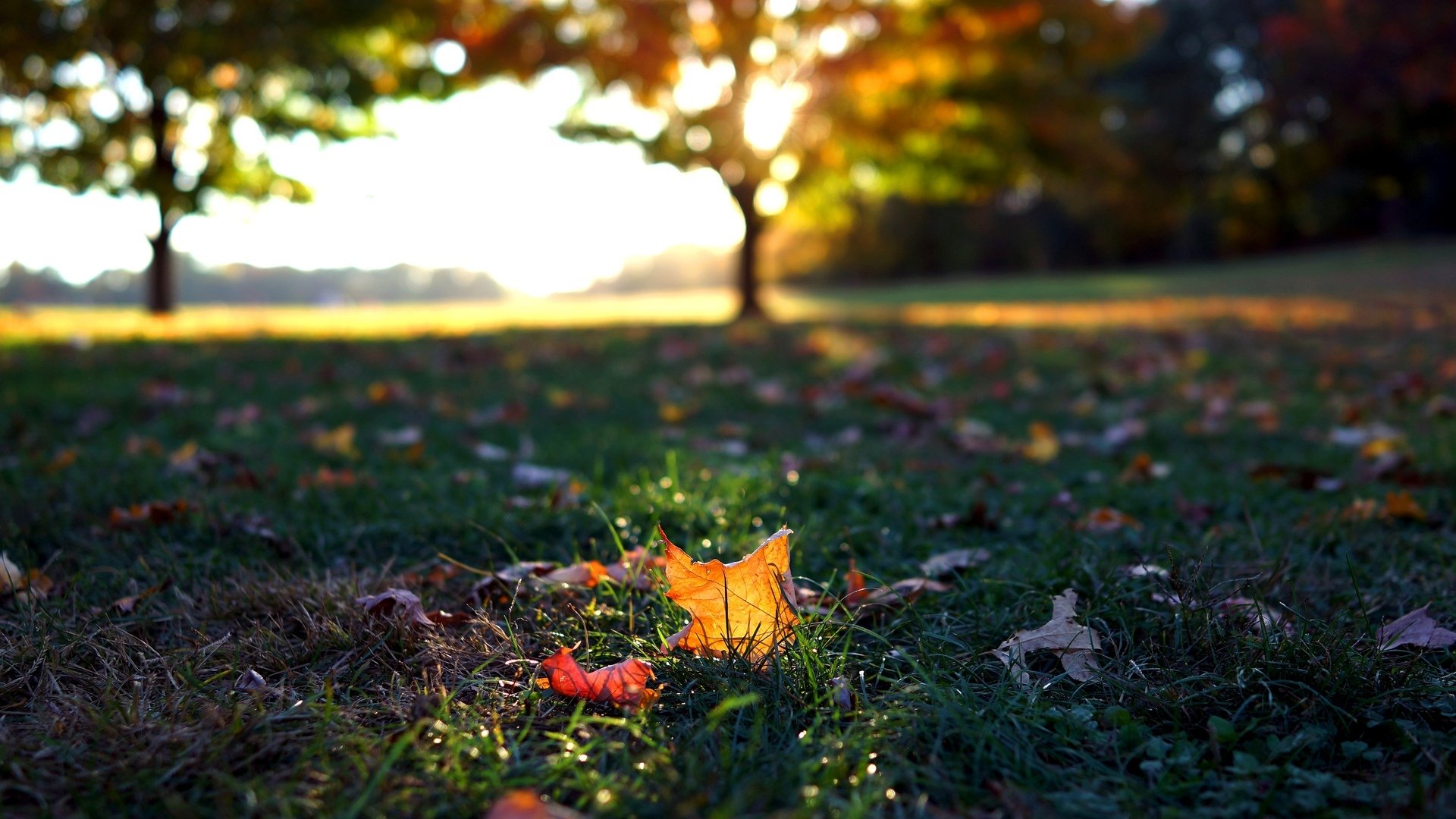 На зелёной траве красный осенний лист