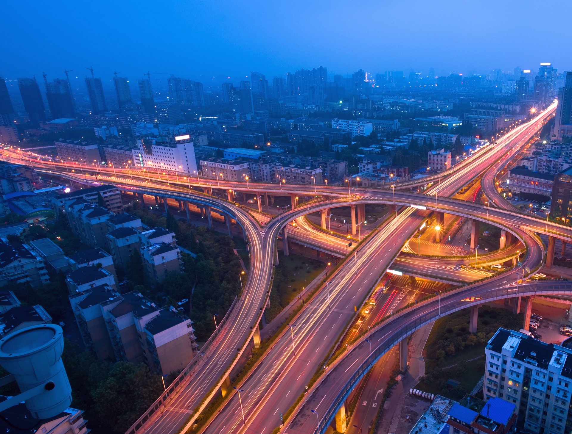 Освещённая городская эстакада в сумерки с высоты птичьего полета