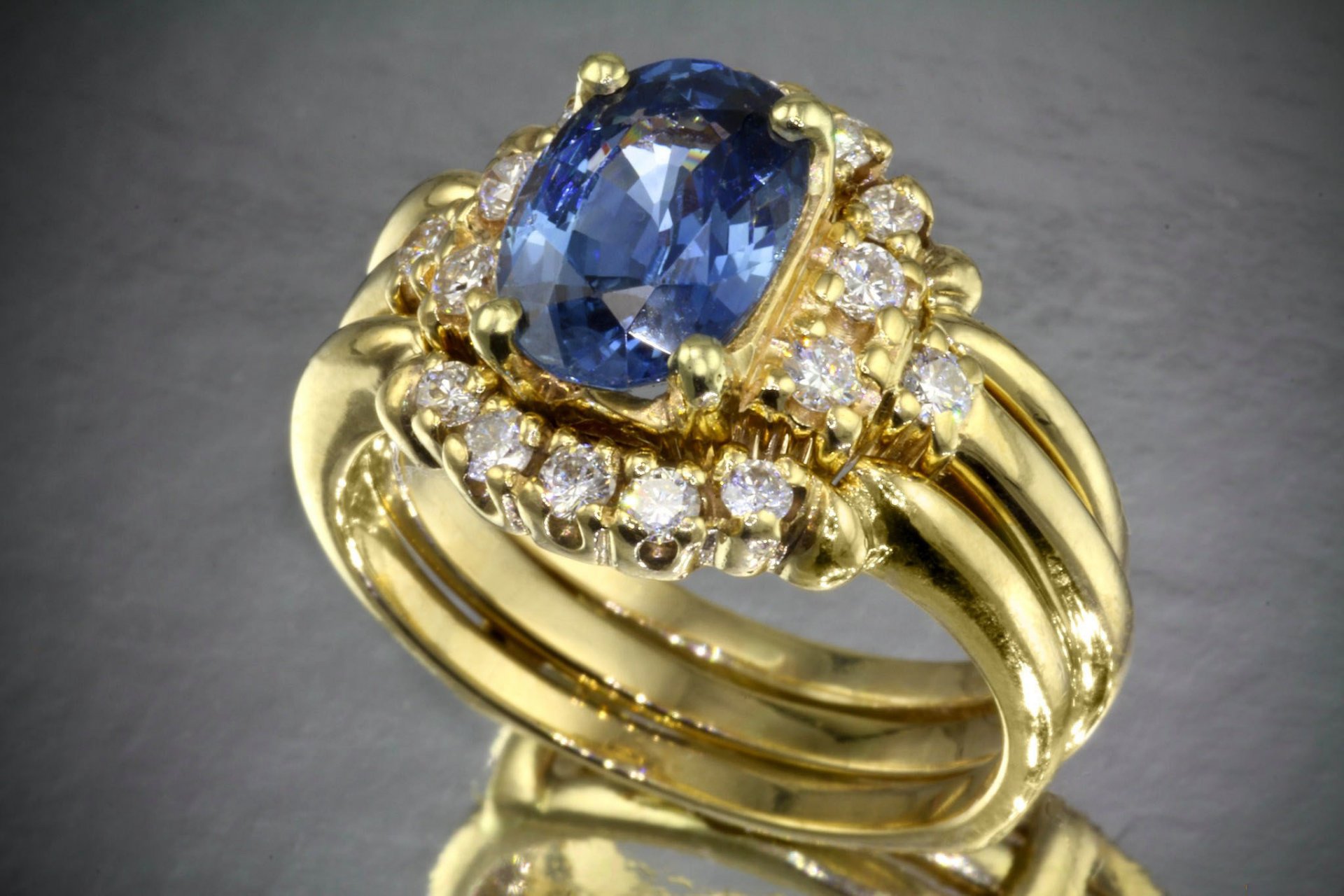 Золотое кольцо с крупным синим камнем и россыпью бриллиантов