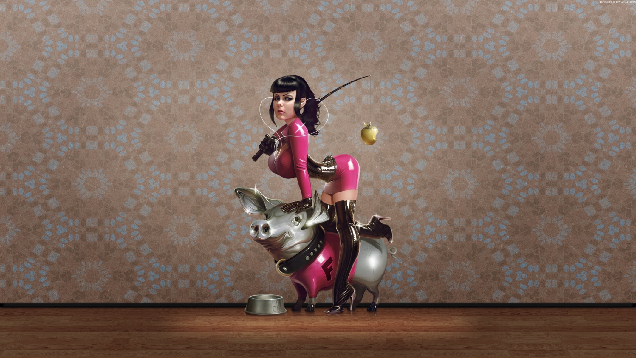 Девушка в розовом латексе с удочкой и яблоком верхом на свинье