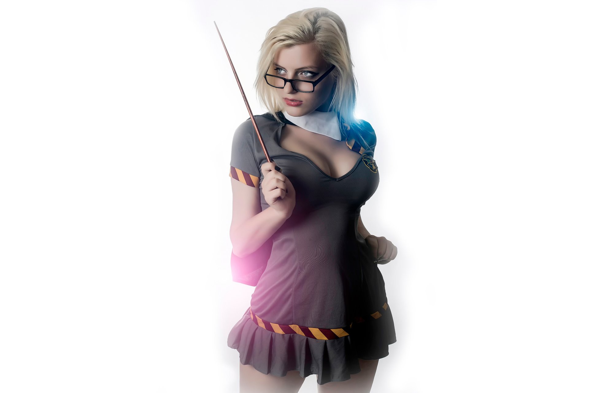 Девушка в черном мини с чулками на каблуках у доски пишет мелом