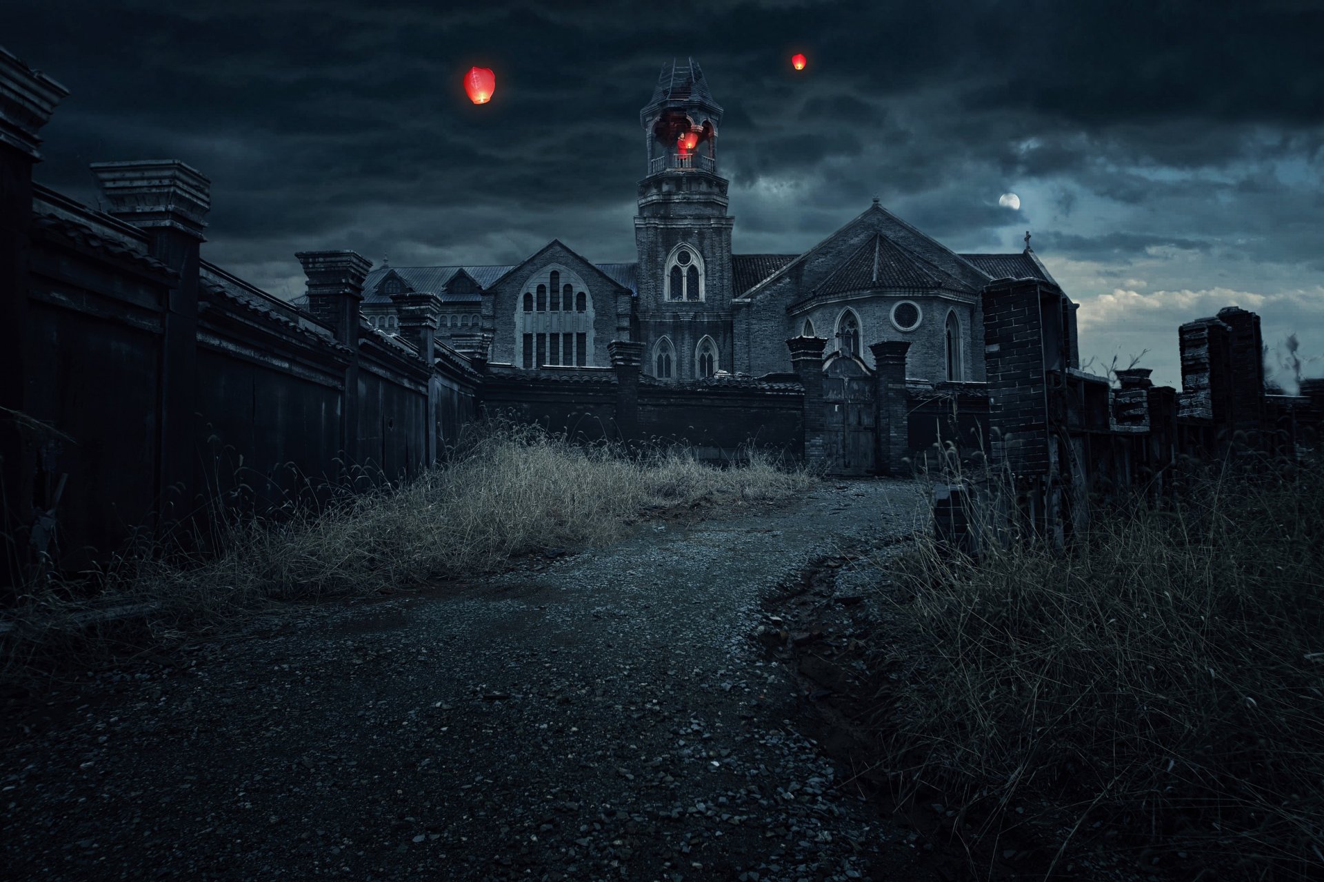 Новогодняя зимняя ночь с фонариками возле домиков и елей