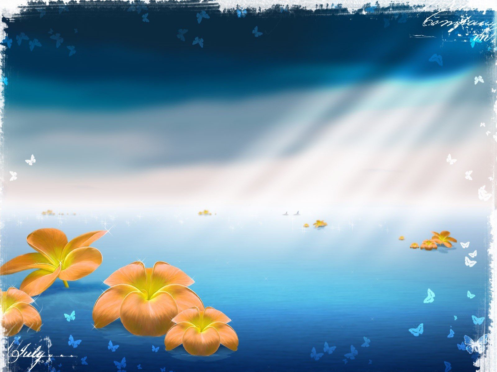 Цветы и бабочки на синем море