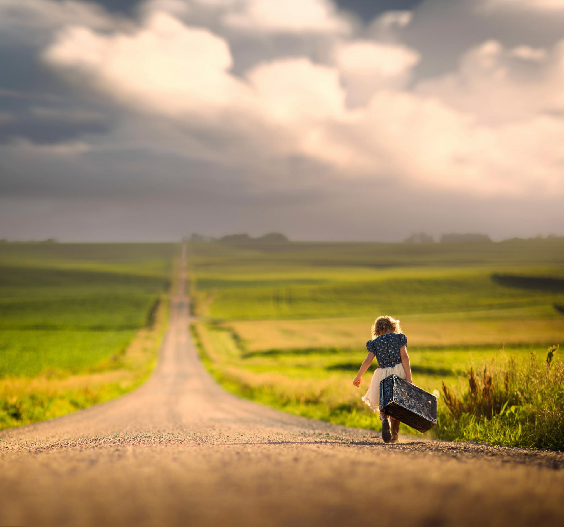 Девушка в шляпе и чемоданом в руках сидит возле железной дороге