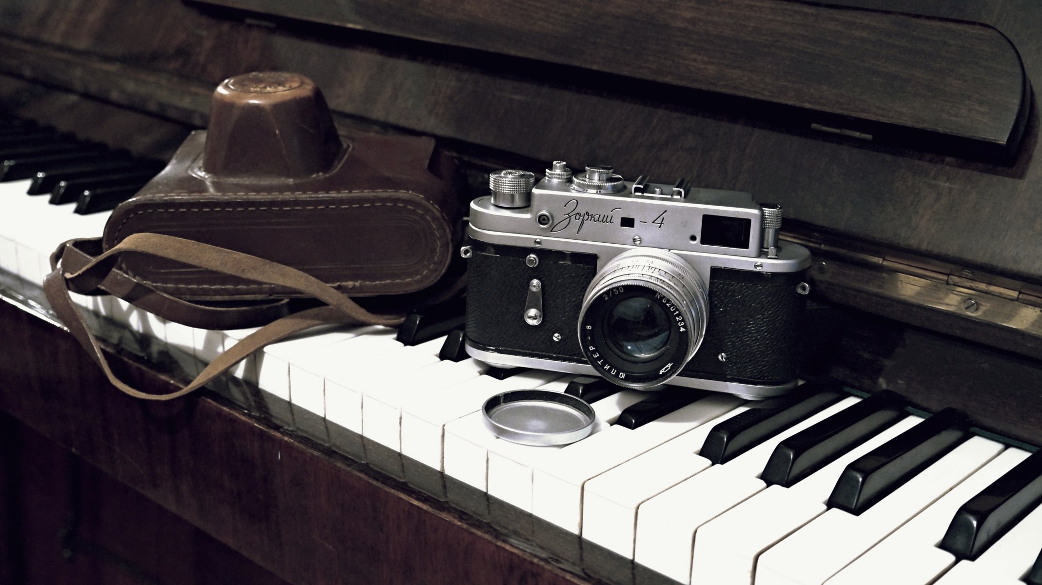 Фотоаппарат и чехол лежат на клавиатуре рояля